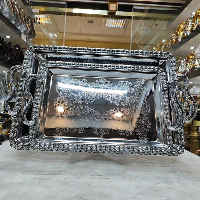 فلزی 0/8 ضخیم جنس دسته ها زاماک (آلیاژ روی و آلومینیوم) در دو سایز بزرگ و کوچک رنگ سیلور کف سینی نقش دار سایز سینی بزرگ (43در29/5) سایز سینی کوچک(35در24) دارای جعبه کادویی زیبا برند وینکس