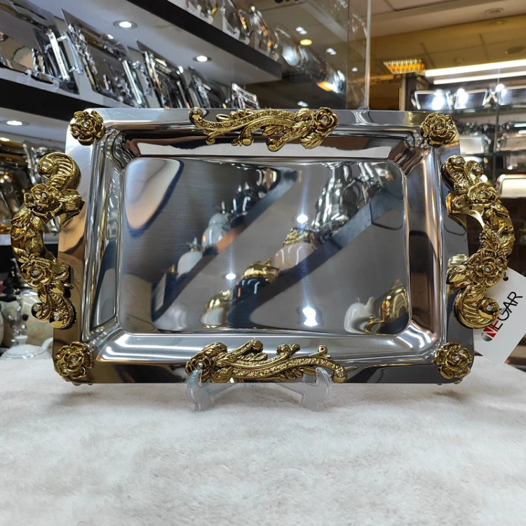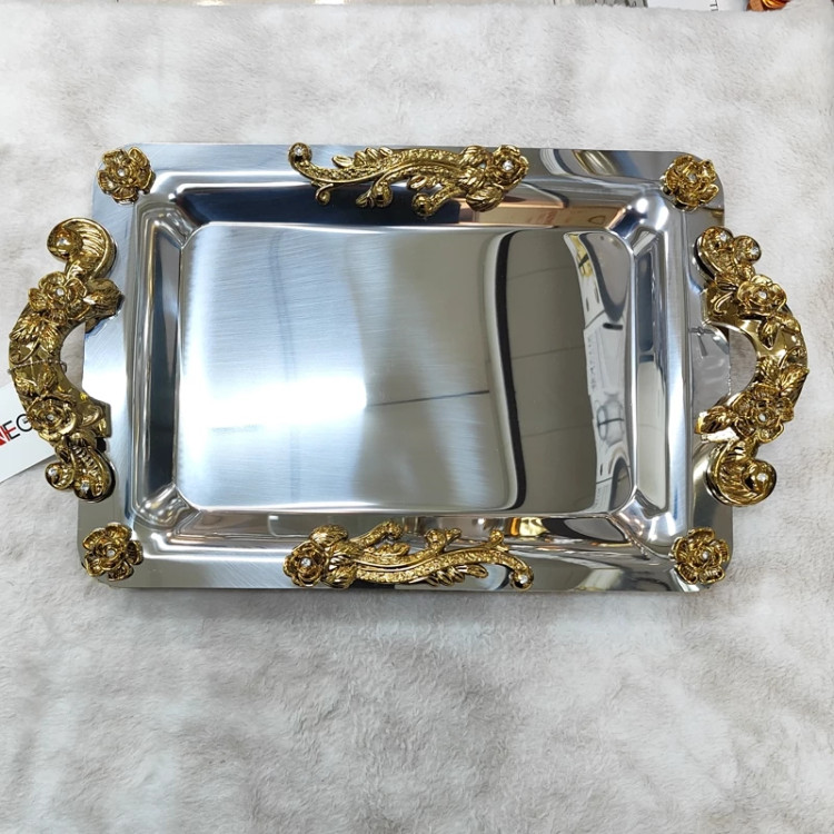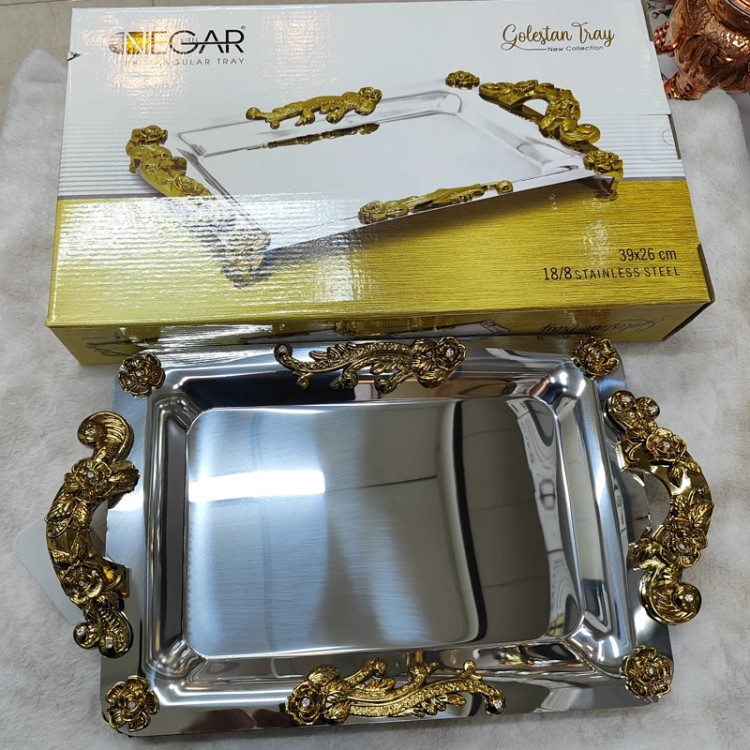سینی استیل پذیرایی پایه دار دسته طلایی(نگار)