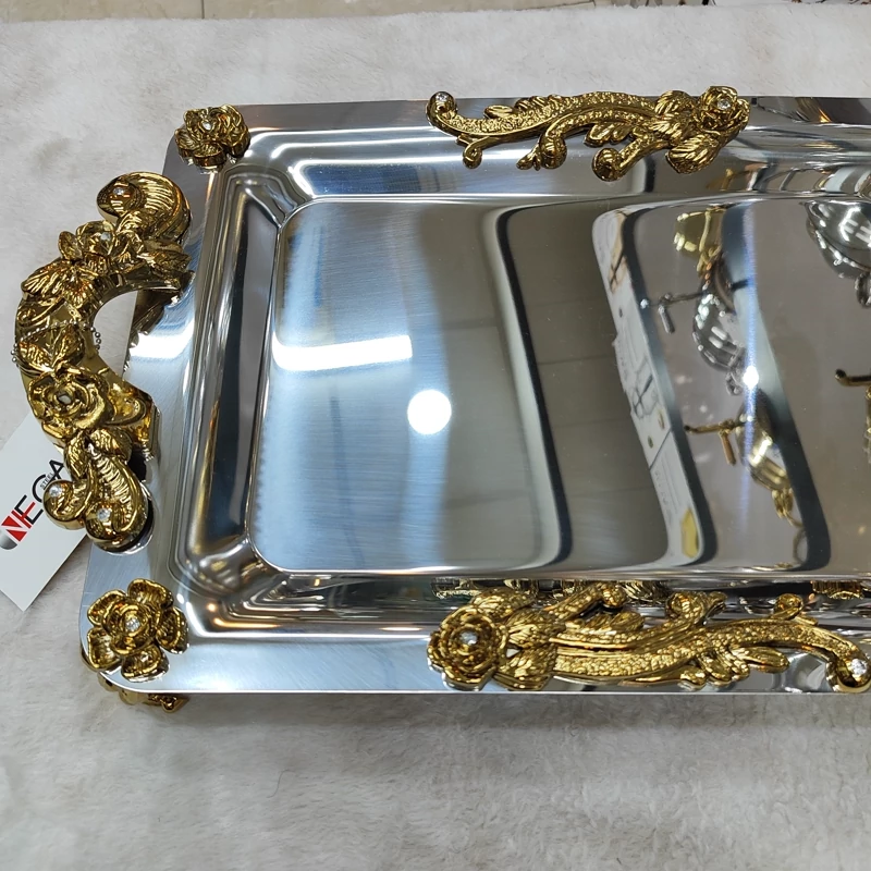 سینی استیل پذیرایی پایه دار دسته طلایی(نگار)