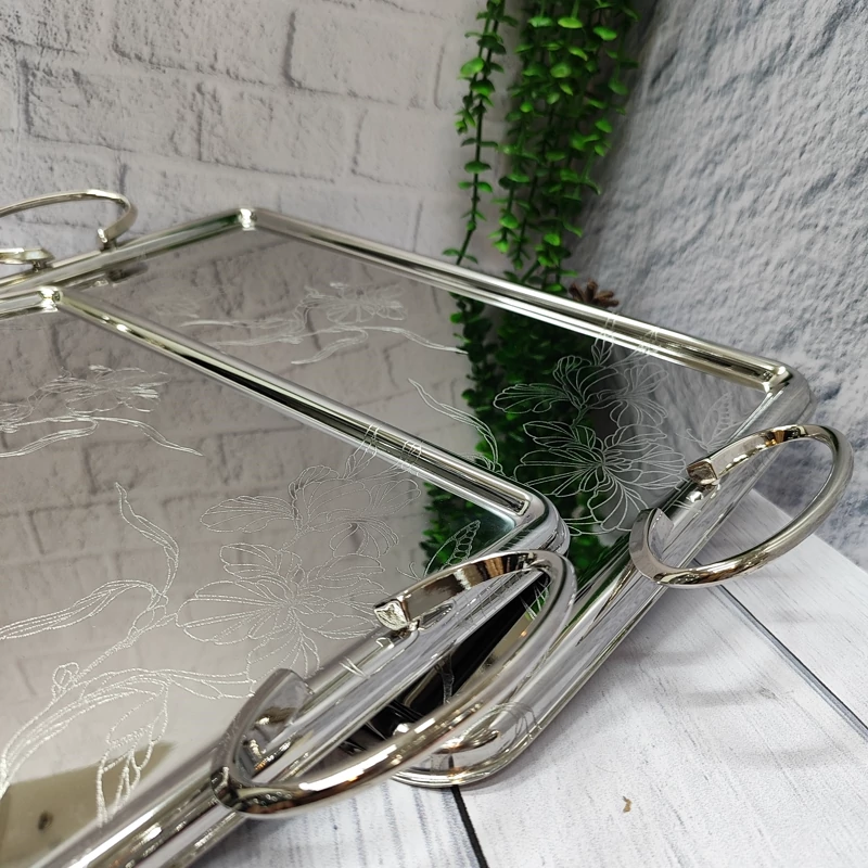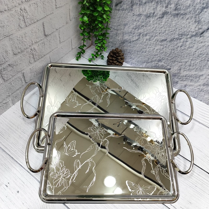 ساخته شده با ورق استیل(نگیر) یک میل ضخیم سنگین و خوش نقش مدل مستطیل گلدار دسته ها از جنس زاماک(آلیاژ روی و آلومینیوم) در دو سایز کوچک و بزرگ اندازه سایز بزرگ(40/5در28)بدون احتساب دسته ها اندازه سایز کوچک(33در 23) بدون احتساب دسته ها مناسب پذیرایی و کادویی دارای جعبه ی رنگی شکیل کادویی پشت سینی ها مات و ضد خش برند(یونی هوم)