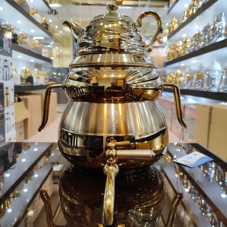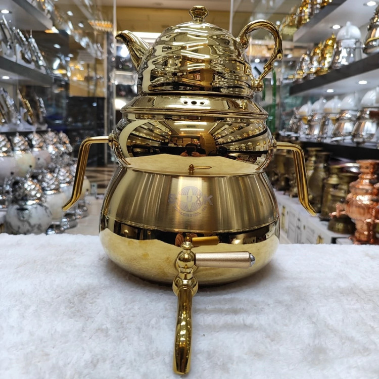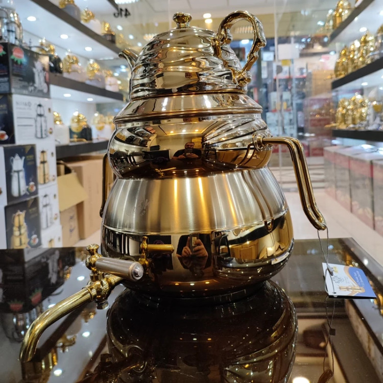 از تولیدات کارخانه با ورق استیل یک میل ضخیم رنگ طلایی ثابت تضمینی داره روی حرارت رنگش به هیچ عنوان عوض نمیشه کفه چدنی ضخیم که ایمنی و دوام کار رو بالا میبره حتی روی حرارت زیاد قابل استفادست گنجایش 6لیتری دسته و شیر خارجی درجه یک قوری چینی کروم طلایی شده زیبا دارای درب شبکه ای 24ماه ضمانت داره برند اس لوکس
