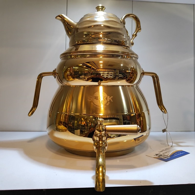 از تولیدات کارخانه با ورق استیل یک میل ضخیم رنگ طلایی ثابت تضمینی داره روی حرارت رنگش به هیچ عنوان عوض نمیشه کفه چدنی ضخیم که ایمنی و دوام کار رو بالا میبره حتی روی حرارت زیاد قابل استفادست گنجایش 6لیتری دسته و شیر خارجی درجه یک قوری چینی کروم طلایی شده زیبا دارای درب شبکه ای 24ماه ضمانت داره برند اس لوکس
