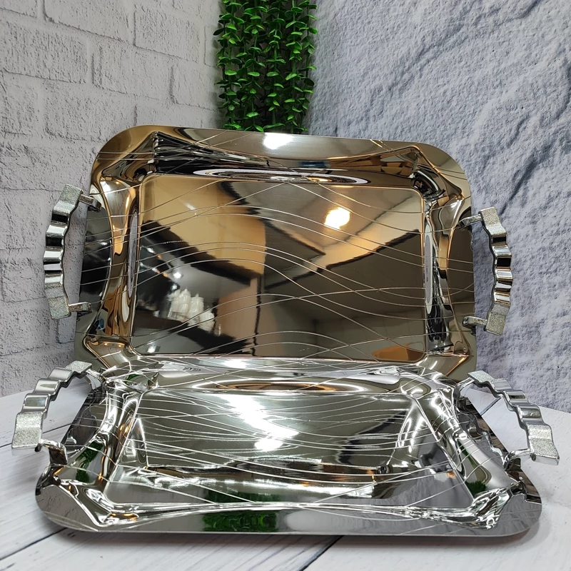استیل یک میل فوق ضخیم خارجی جنس دسته ها زاماک (آلیاژ روی و آلومینیوم)درجه یک در دو سایز استاندارد کاربردی . سایز سینی بزرگ(42در30) سایز سینی کوچک(35در25) سایز کف سینی بزرگ(32در 20) سایز کف سینی کوچک(27در 17) دارای جعبه کادویی زیبا همراه با کاور با 24ماه ضمانت برند ویتارا