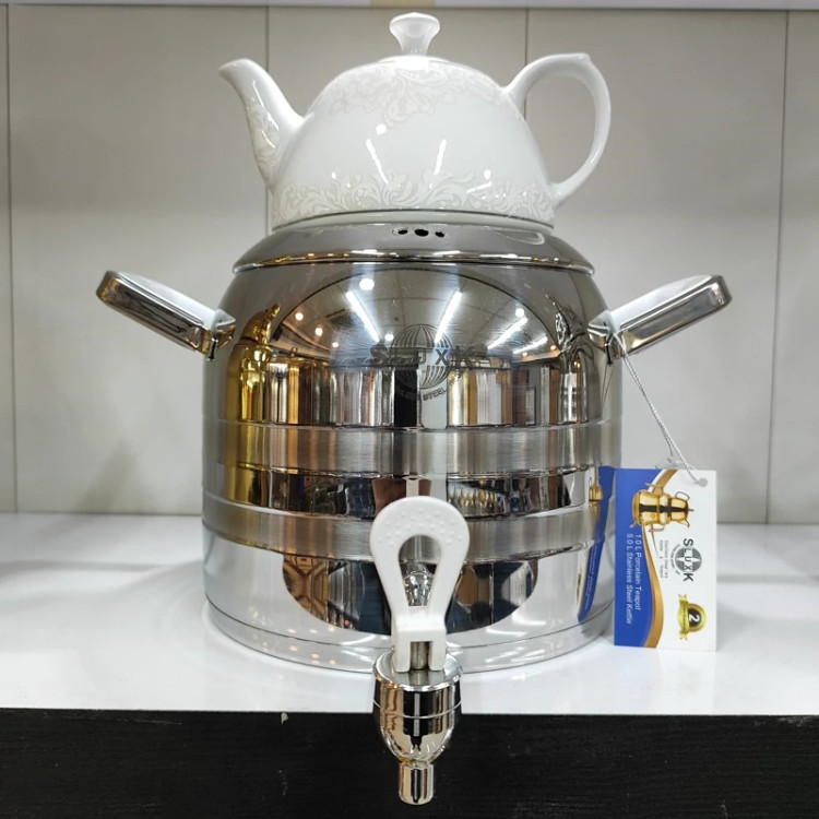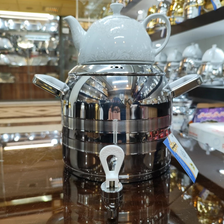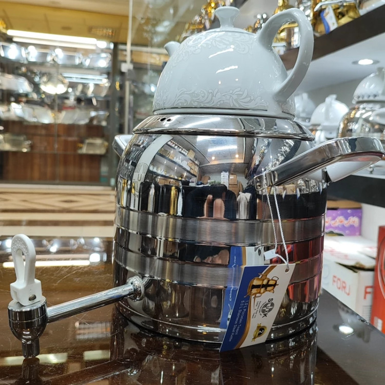 قالب تُرک جدید ساخته شده با ورق استیل ضخیم یک میل درجه یک 6لیتری سایز بزرگ دسته و شیر مدل جدید خارجی کف چدن ایمن و مقاوم که خیالتونو از بابت گزاشتن روی شعله ی زیاد راحت میکنه دارای درب شبکه ای قوری چینی گلدار اعلا 24ماه ضمانت برند اس لوکس