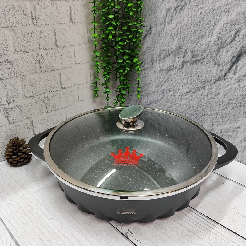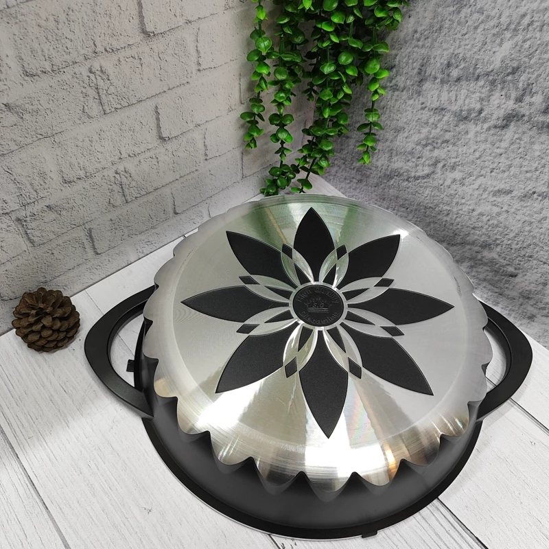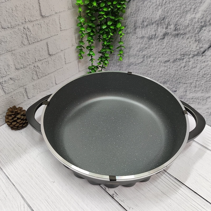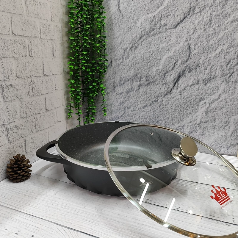 بهترین برند موجود در بازار چدن سنگین و ضخیم دارای درب پیرکس قپه و زه استیل داخل تمام گرانیت کف اینداکشن سایز 36 ارتفاع تابه بدون درب 9/5سانتی متر رنگ مشکی برند اس جی