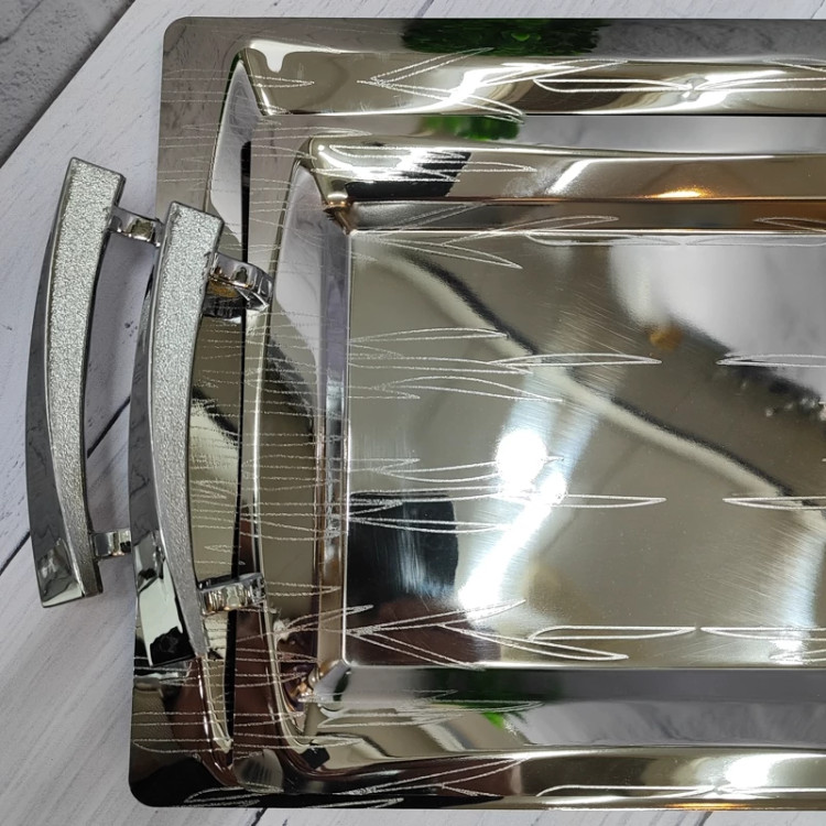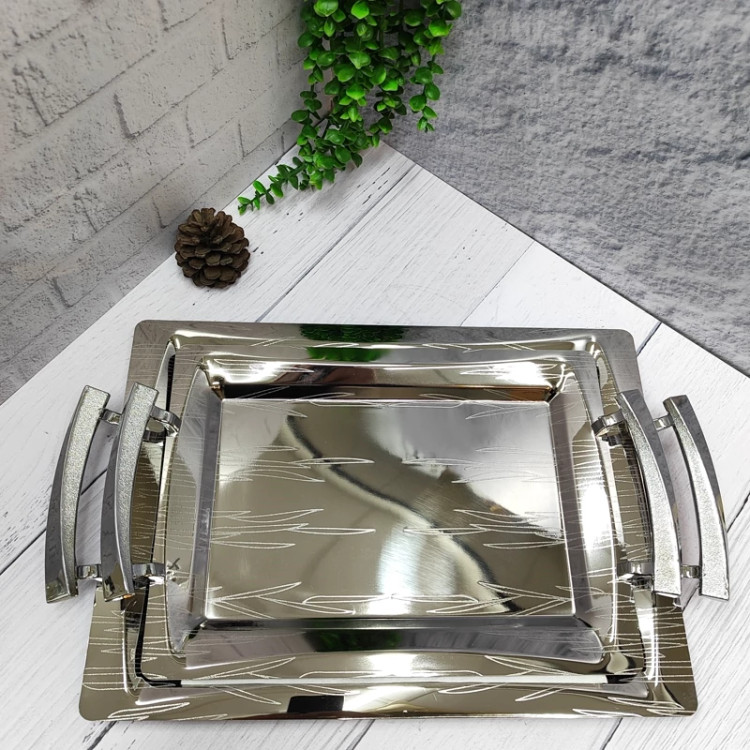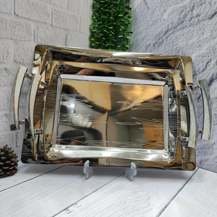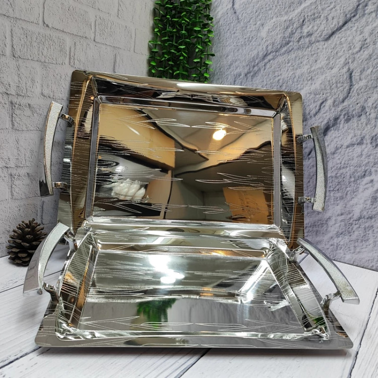 استیل یک میل فوق ضخیم خارجی جنس دسته ها زاماک﴿آلیاژ روی و آلومینیوم) درجه یک در دو سایز استاندارد کاربردی . سایز سینی بزرگ(42در30) سایز سینی کوچک(35در25) سایز کف سینی بزرگ(32در 20) سایز کف سینی کوچک(27در 17) دارای جعبه کادویی زیبا همراه با کاور با 24ماه ضمانت برند وینکس