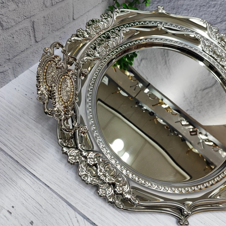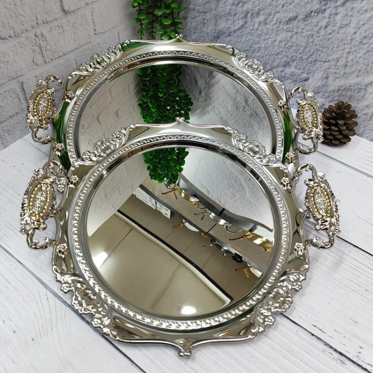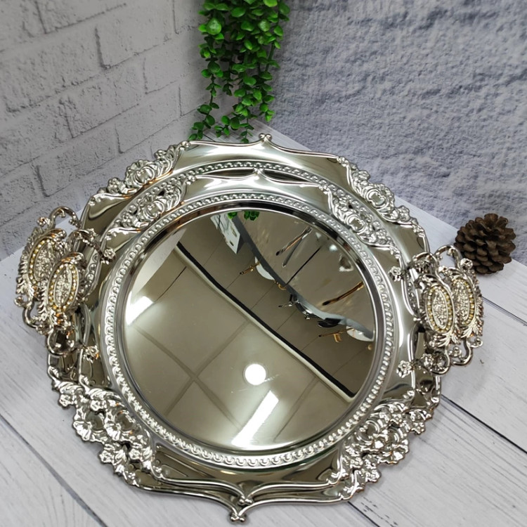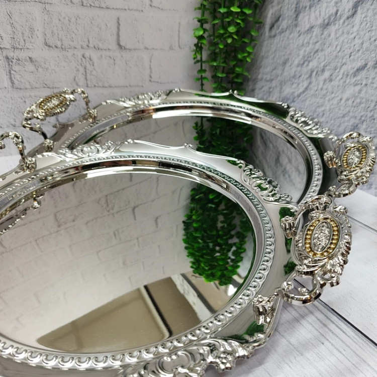 ساخته شده با ورق استیل(نگیر) یک میل ضخیم سنگین و خوش نقش مدل گرد کنگره دسته ها از جنس زاماک(آلیاژ روی و آلومینیوم) در دو سایز کوچک و بزرگ اندازه سایز بزرگ(39)بدون احتساب دسته ها اندازه سایز کوچک(33) بدون احتساب دسته ها مناسب پذیرایی و کادویی دارای جعبه ی رنگی شکیل کادویی پشت سینی ها مات و ضد خش برند(یونی هوم)