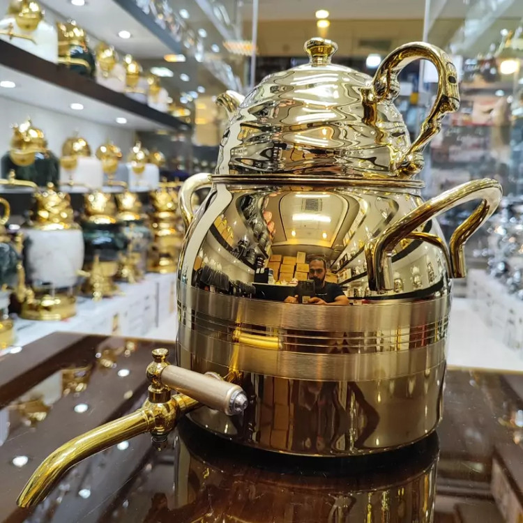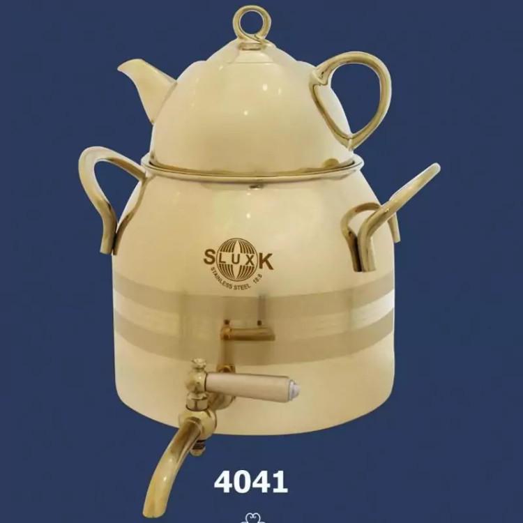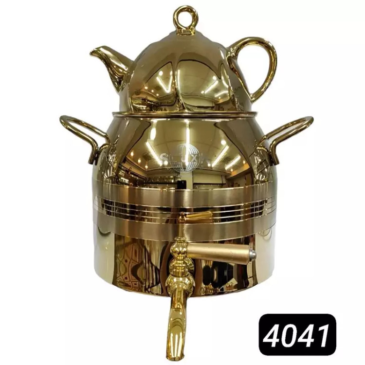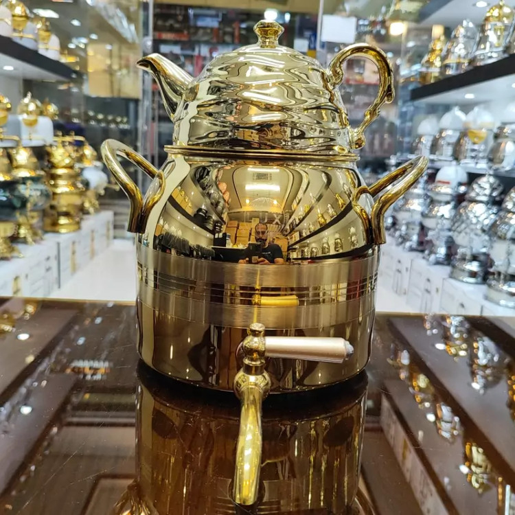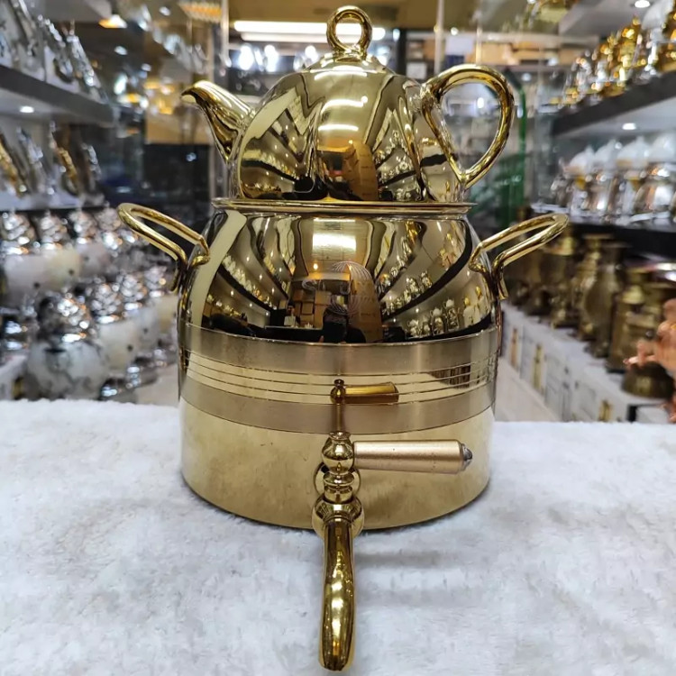 از تولیدات کارخانه با ورق استیل ضخیم یک میل تمام طلایی رنگ ثابت تضمینی کف چدنی و مقاوم زیر کتری باعث میشه با خیال راحت بتونید روی حرارت زیاد با خیال راحتاستفاده کنید گنجایش 4لیتری اب دسته و شیر خارجی دارای درب شبکه ای قوری چینی طرحدار طلایی پی وی دی شده ضمانت 24ماهه برند اس لوکس