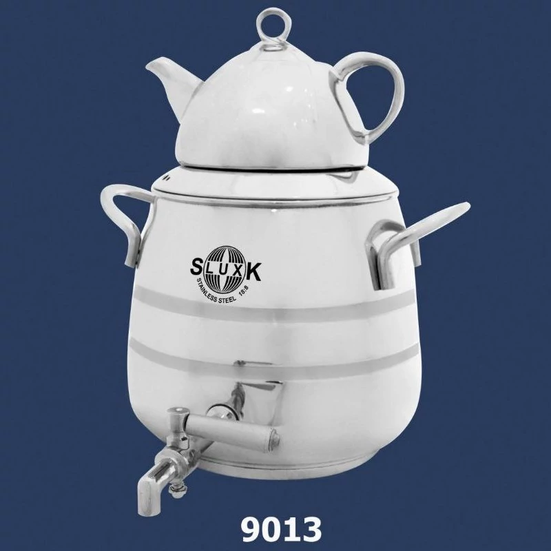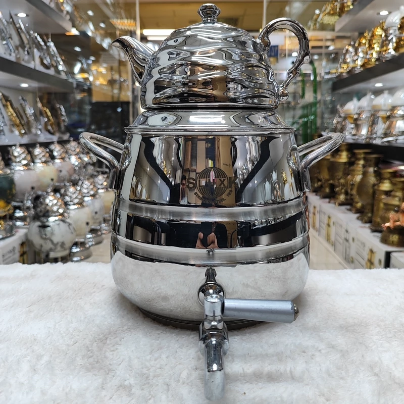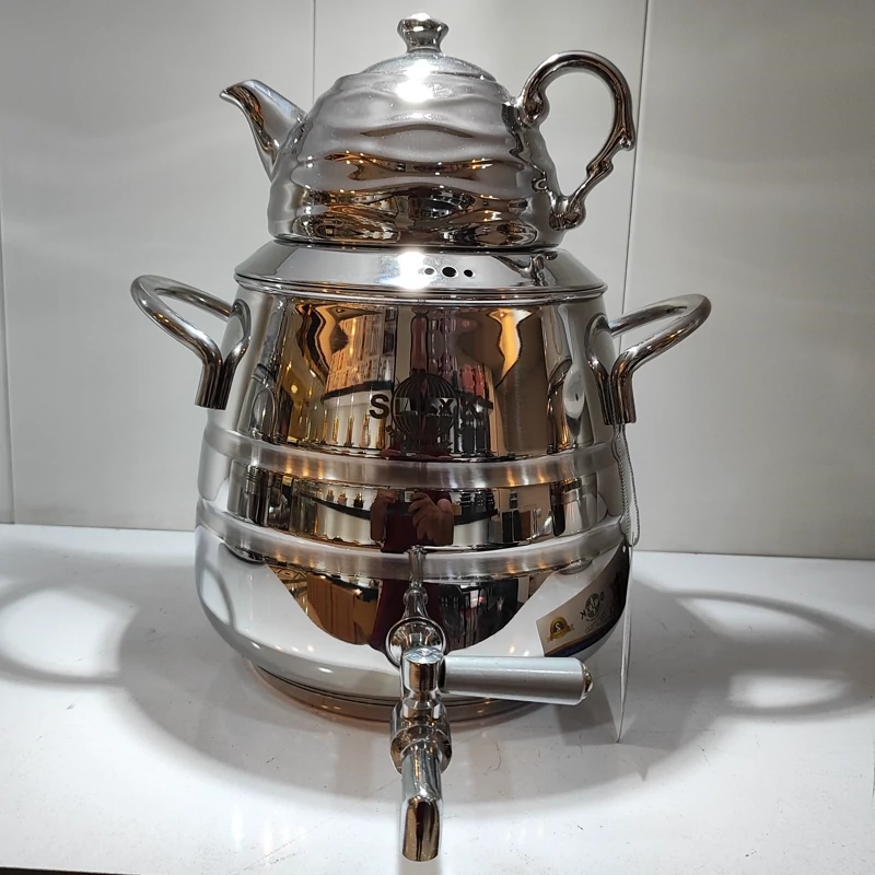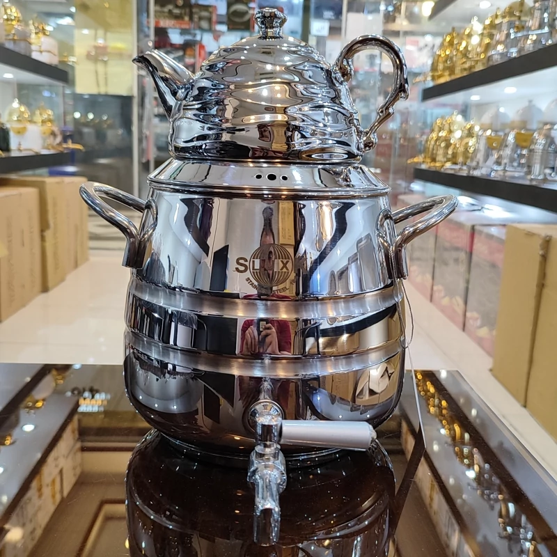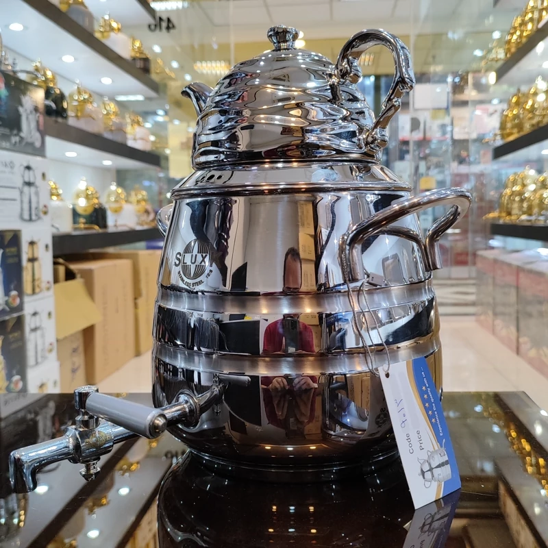 از تولیدات کارخانه با ورق استیل یک میل ضخیم دارای کفه چدنی که باعث ایمنی و دوام کار میشه و باعث میشه با خیال راحت روی حرارت زیاد هم بتونید استفاده کنید حجم 6لیتر اب دسته و شیر خارجی درجه یک دارای درب شبکه ای قوری چینی کروم شده طرح دار زیبا 24ماه ضمانت داره برند اس لوکس