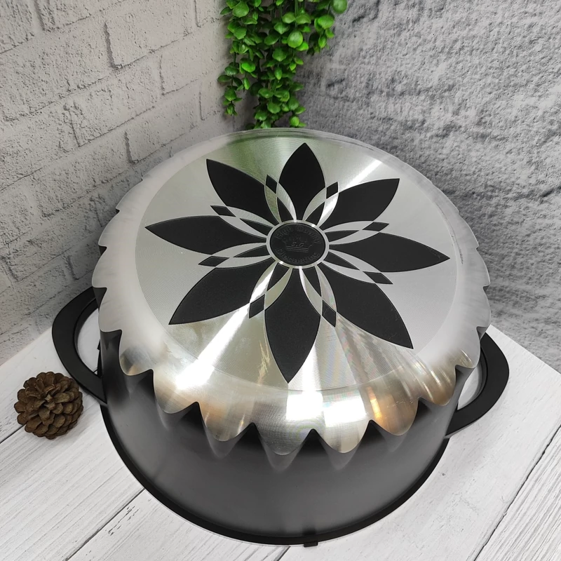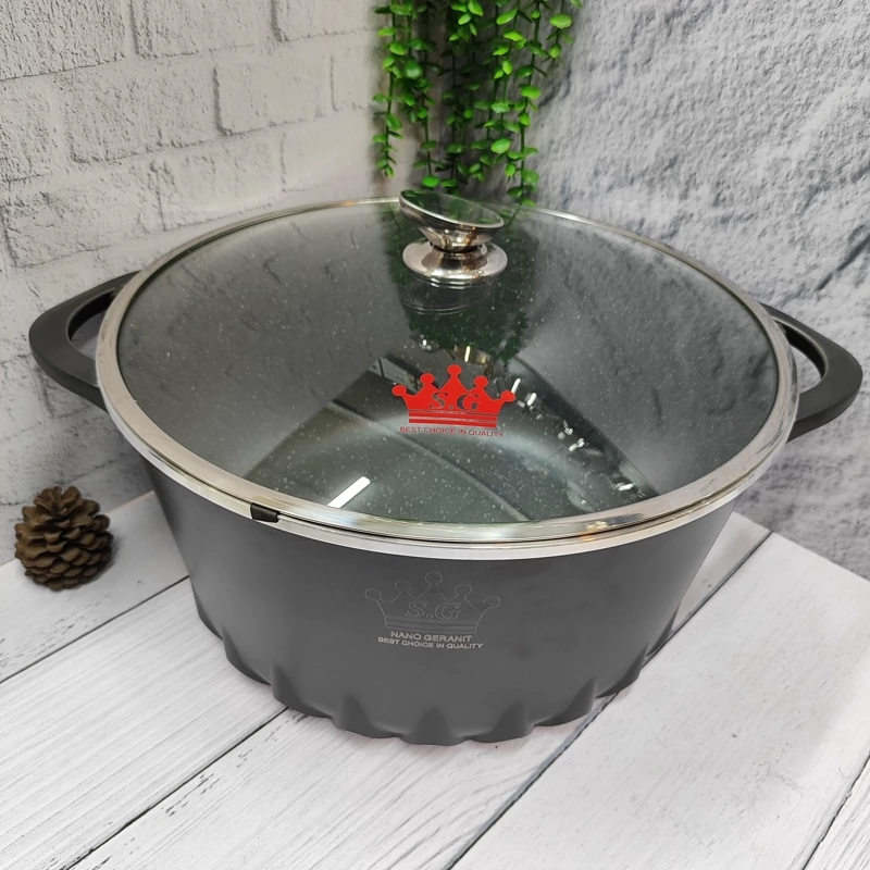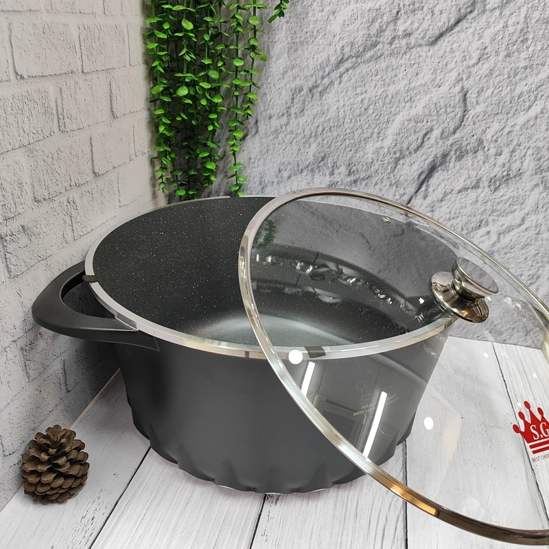 بهترین برند موجود در بازار چدن سنگین و ضخیم دارای درب پیرکس قپه و زه استیل داخل تمام گرانیت کف اینداکشن سایز 40 ارتفاع قابلمه بدون درب 20سانتی متر رنگ مشکی برند اس جی