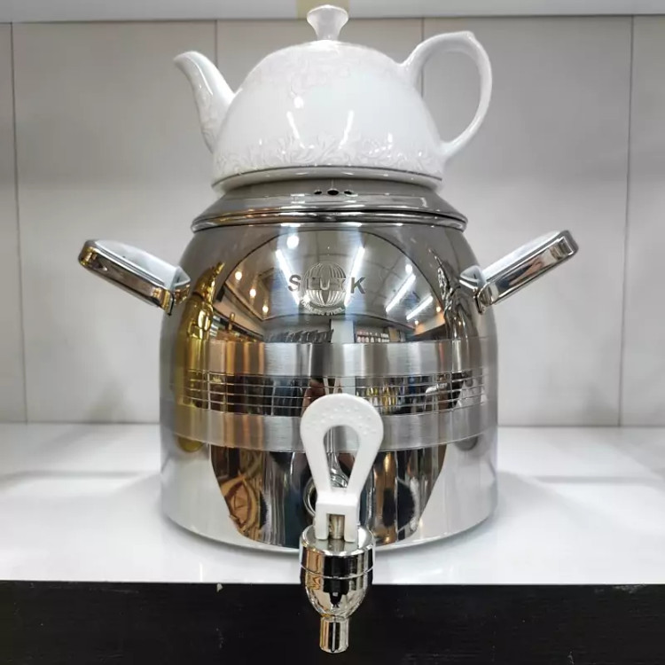 تولید شده با ورق استیل یک میل ضخیم کفه چدنی ایمن کف کتری باعث مقاوم بودن در برابر حرارت زیاد میشه دسته ها ی جدید خارجی باکالیتی با روکش استیل شیر جدید خارجی مدل ترک گنجایش 6لیتری داره کتری قوری چینی اعلا از برند شکس با طراحی زیبا ضمانت 24ماهه