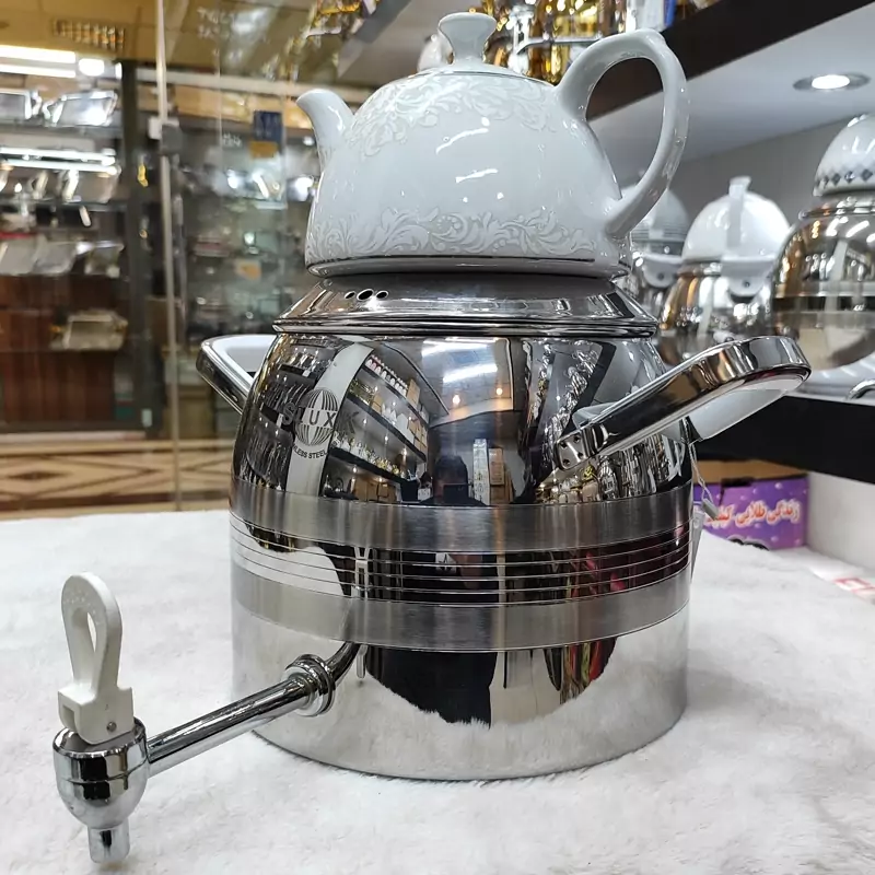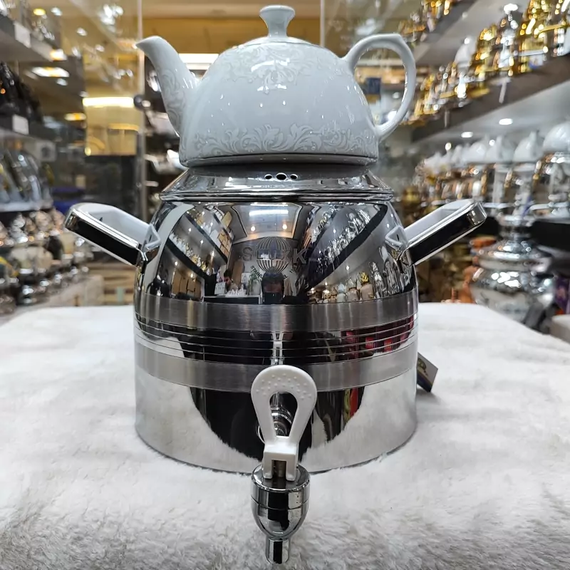 تولید شده با ورق استیل یک میل ضخیم کفه چدنی ایمن کف کتری باعث مقاوم بودن در برابر حرارت زیاد میشه دسته ها ی جدید خارجی باکالیتی با روکش استیل شیر جدید خارجی مدل ترک گنجایش 6لیتری داره کتری قوری چینی اعلا از برند شکس با طراحی زیبا ضمانت 24ماهه