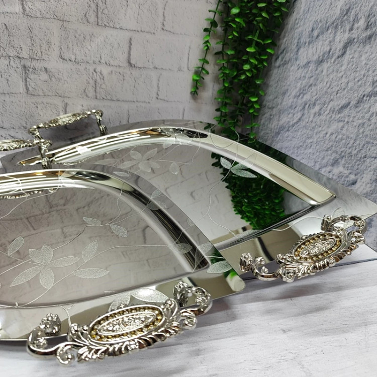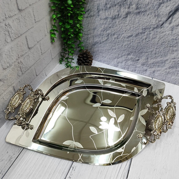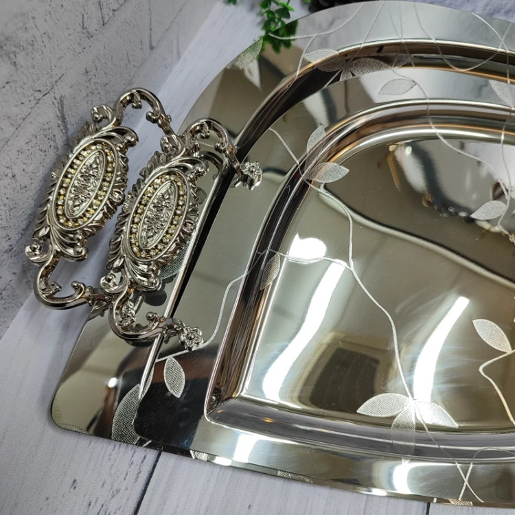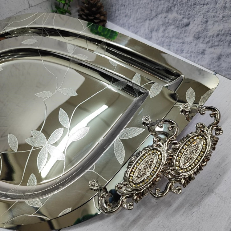 ساخته شده با ورق استیل(نگیر) یک میل ضخیم سنگین و خوش نقش مدل اشکی گلدار دسته ها از جنس زاماک(آلیاژ روی و آلومینیوم) در دو سایز کوچک و بزرگ اندازه سایز بزرگ(51در33)بدون احتساب دسته ها اندازه سایز کوچک(42در 27) بدون احتساب دسته ها مناسب پذیرایی و کادویی دارای جعبه ی رنگی شکیل کادویی پشت سینی ها مات و ضد خش برند(یونی هوم)