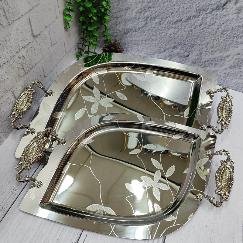ساخته شده با ورق استیل(نگیر) یک میل ضخیم سنگین و خوش نقش مدل اشکی گلدار دسته ها از جنس زاماک(آلیاژ روی و آلومینیوم) در دو سایز کوچک و بزرگ اندازه سایز بزرگ(51در33)بدون احتساب دسته ها اندازه سایز کوچک(42در 27) بدون احتساب دسته ها مناسب پذیرایی و کادویی دارای جعبه ی رنگی شکیل کادویی پشت سینی ها مات و ضد خش برند(یونی هوم)