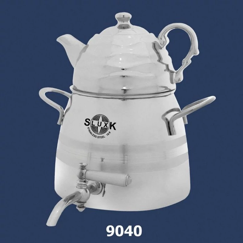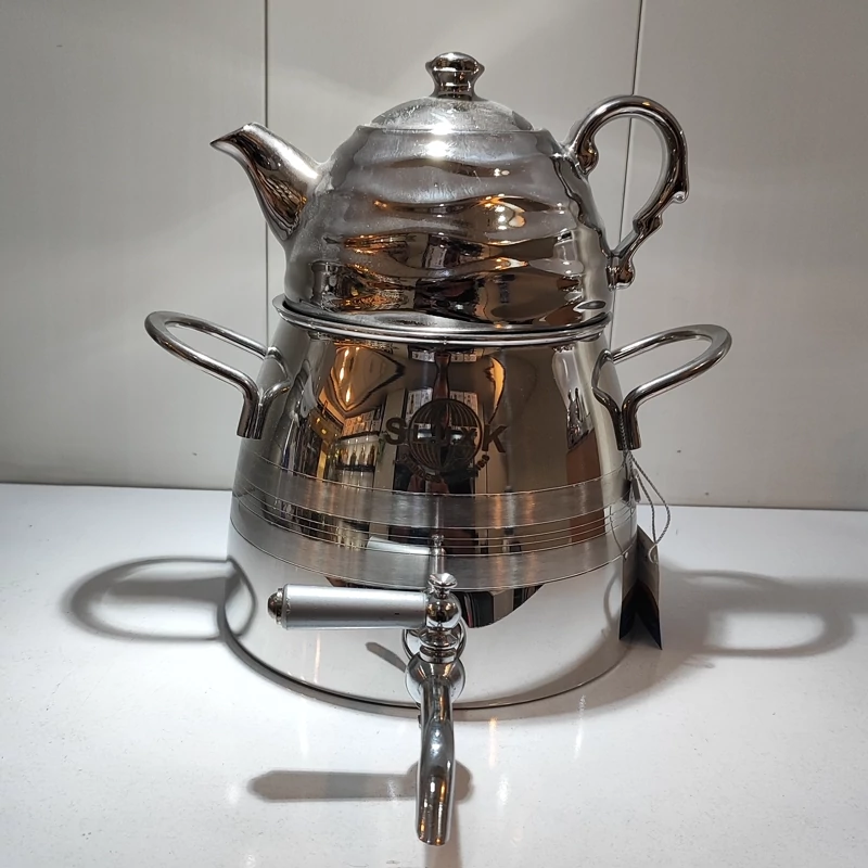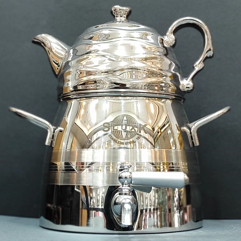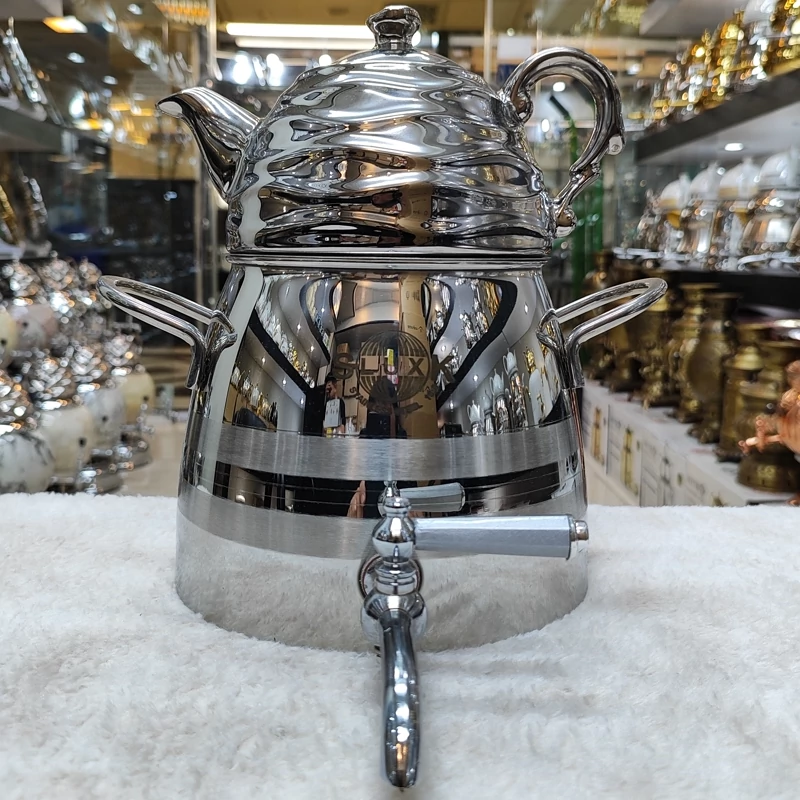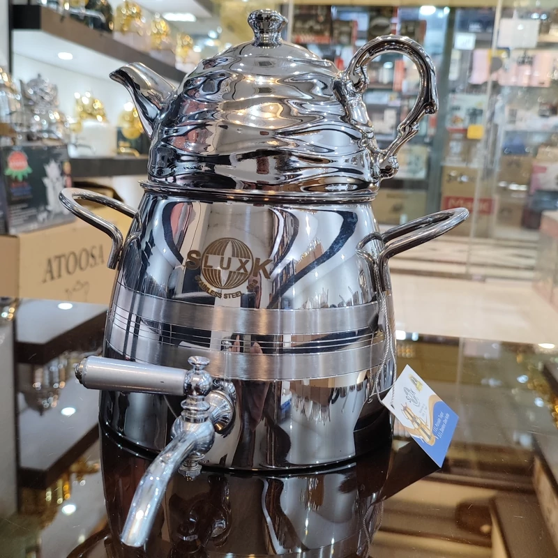 از تولیدات شیک و نقلی کارخانه با استیل ورق یک میل ضخیم با کفه چدنی مقاوم که ایمنی کارو در برابر حرارت زیاد بالا میبره کتری با گنجایش 3لیتر آب مناسب برای عروس خانوم ها دسته و شیر خارجی به کار برده شده قوری چینی کروم شده با طراحی زیبا دارای درب شبکه ای با ضمانت 24ماهه برند اس لوکس