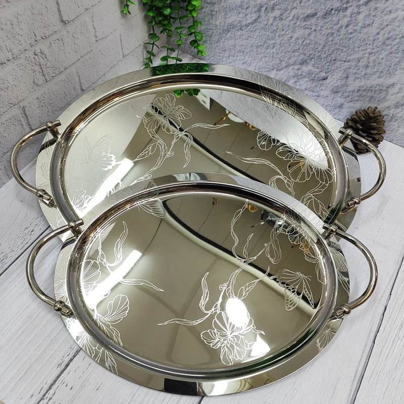 ساخته شده با ورق استیل(نگیر) یک میل ضخیم سنگین و خوش نقش مدل بیضی گلدار دسته ها از جنس زاماک(آلیاژ روی و آلومینیوم) در دو سایز کوچک و بزرگ اندازه سایز بزرگ(43/5در33/5)بدون احتساب دسته ها اندازه سایز کوچک(35در 27) بدون احتساب دسته ها مناسب پذیرایی و کادویی دارای جعبه ی رنگی شکیل کادویی پشت سینی ها مات و ضد خش برند(یونی هوم)