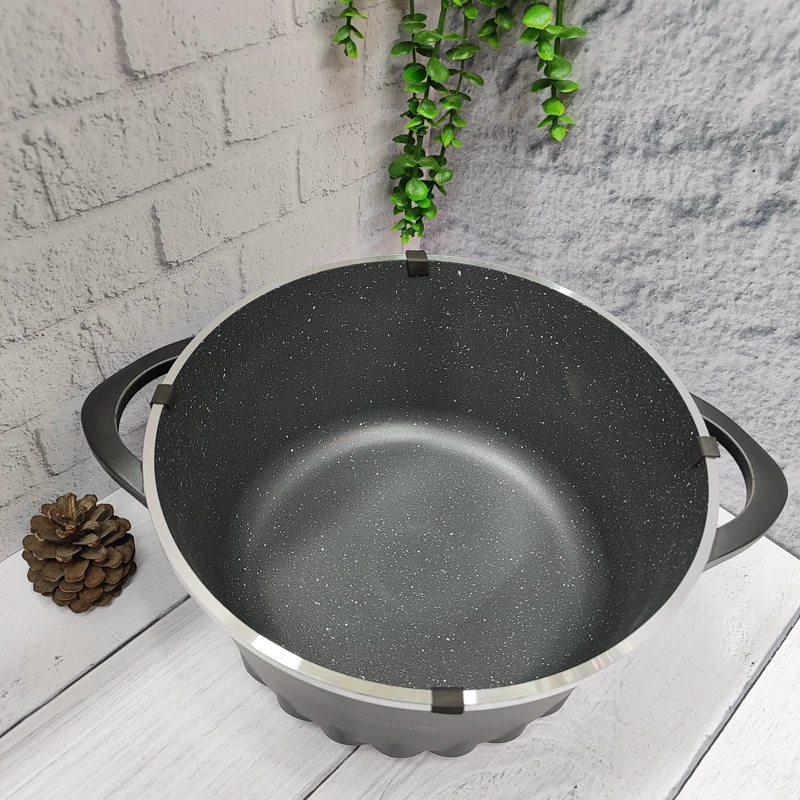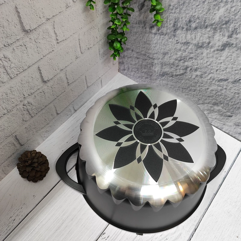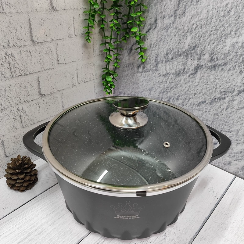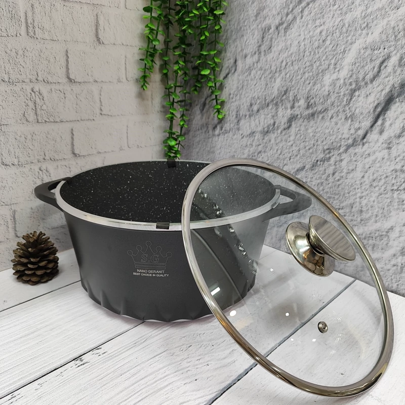 بهترین برند موجود در بازار چدن سنگین و ضخیم دارای درب پیرکس قپه و زه استیل داخل تمام گرانیت کف اینداکشن سایز 16 ارتفاع قابلمه بدون درب 9/5سانتی متر رنگ مشکی برند اس جی