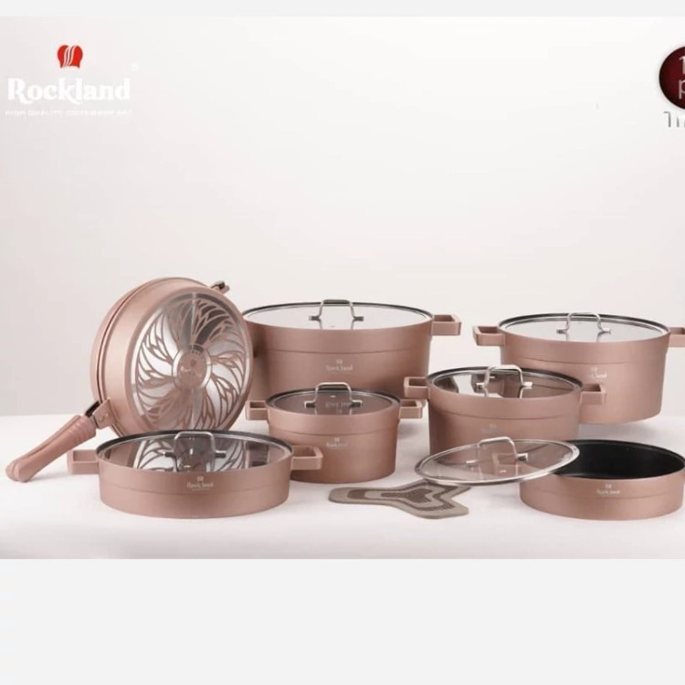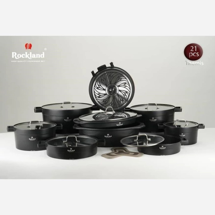 چدن ضخیم گرانیتی نچسب در 4 رنگ مشکی، طوسی ،رزگلد و بادمجانی دارای 4عدد قابلمه در سایزهای 32،28،24،20 و دو عدد تابه در سایزهای 24و28 یک عدد تابه رژیمی گرد یک عدد تابه مرغ و ماهی به همراه یک عدد زیر قابلمه ای مدل تمیس دارای درب پیرکس با زه و قپه های استیل 21پارچه برند راکلند