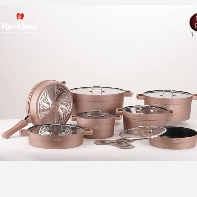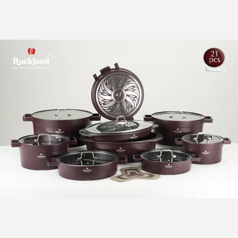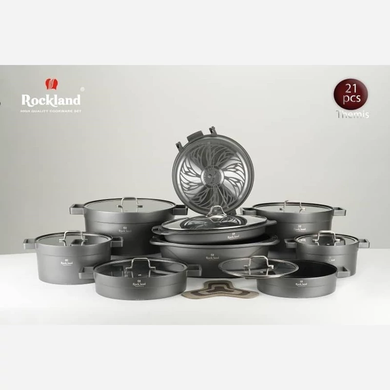 چدن ضخیم گرانیتی نچسب در 4 رنگ مشکی، طوسی ،رزگلد و بادمجانی دارای 4عدد قابلمه در سایزهای 32،28،24،20 و دو عدد تابه در سایزهای 24و28 یک عدد تابه رژیمی گرد یک عدد تابه مرغ و ماهی به همراه یک عدد زیر قابلمه ای مدل تمیس دارای درب پیرکس با زه و قپه های استیل 21پارچه برند راکلند