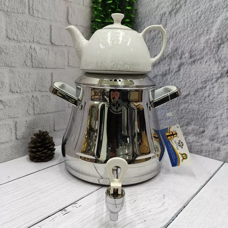 ساخته شده با ورق استیل یک میل ضخیم و سنگین غالب اختصاصی کارخانه دارای کفه ی چدنی ایمن و مقاوم دسته استیل باکالیت جدید خارجی شیر مدل جدید اعلا خارجی 6لیتری دارای درب شبکه ای قوری چینی گلدار اعلا 24ماه ضمانت برند اس لوکس