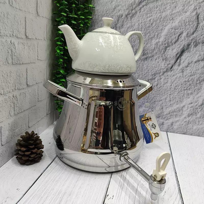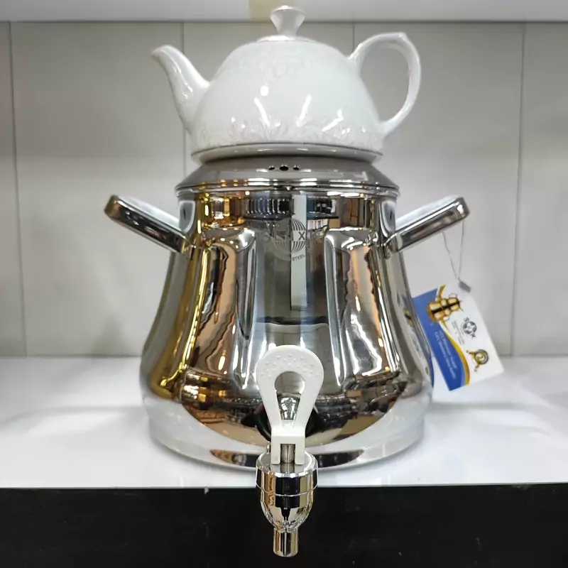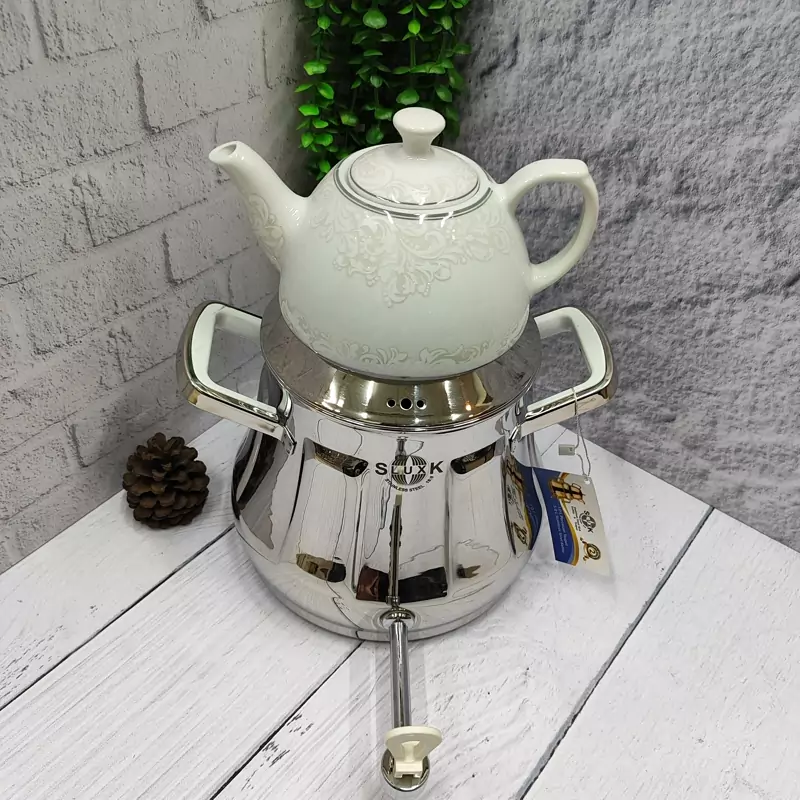 ساخته شده با ورق استیل یک میل ضخیم و سنگین غالب اختصاصی کارخانه دارای کفه ی چدنی ایمن و مقاوم دسته استیل باکالیت جدید خارجی شیر مدل جدید اعلا خارجی 6لیتری دارای درب شبکه ای قوری چینی گلدار اعلا 24ماه ضمانت برند اس لوکس