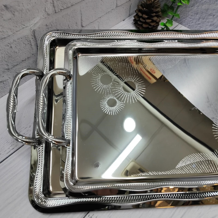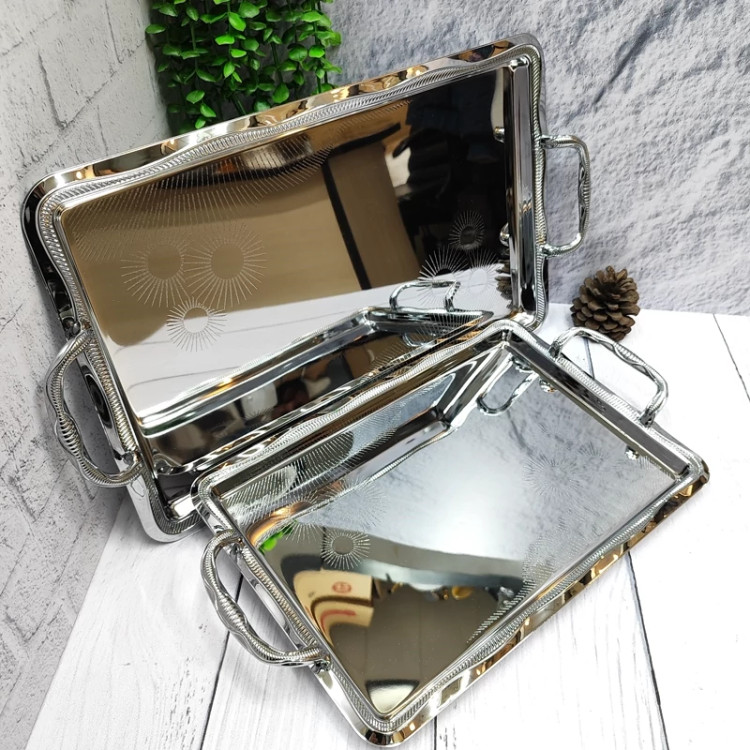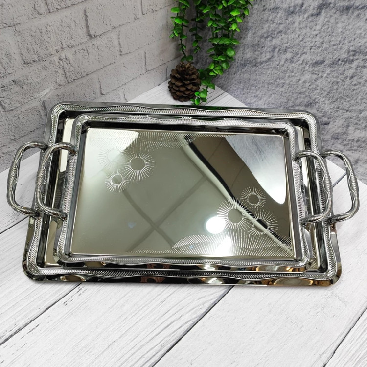 فلزی ضخیم با ورق 0/6 سیلور کف سینی طرح دار دو عددی در دو سایز بزرگ و کوچک سایز بزرگ(42/5در27/5)بدون احتساب دسته سایز کوچک(34/5 در 23/5) بدون احتساب دسته دسته ها از جنس زاماک(آلیاژ روی و الومینیوم) جعبه کادویی زیبا برند وینکس