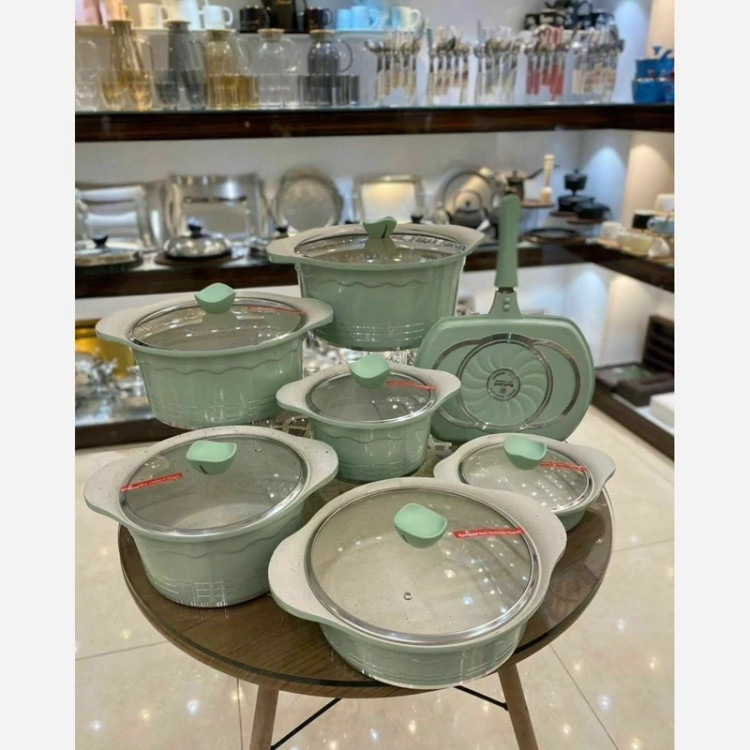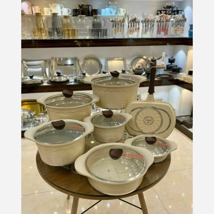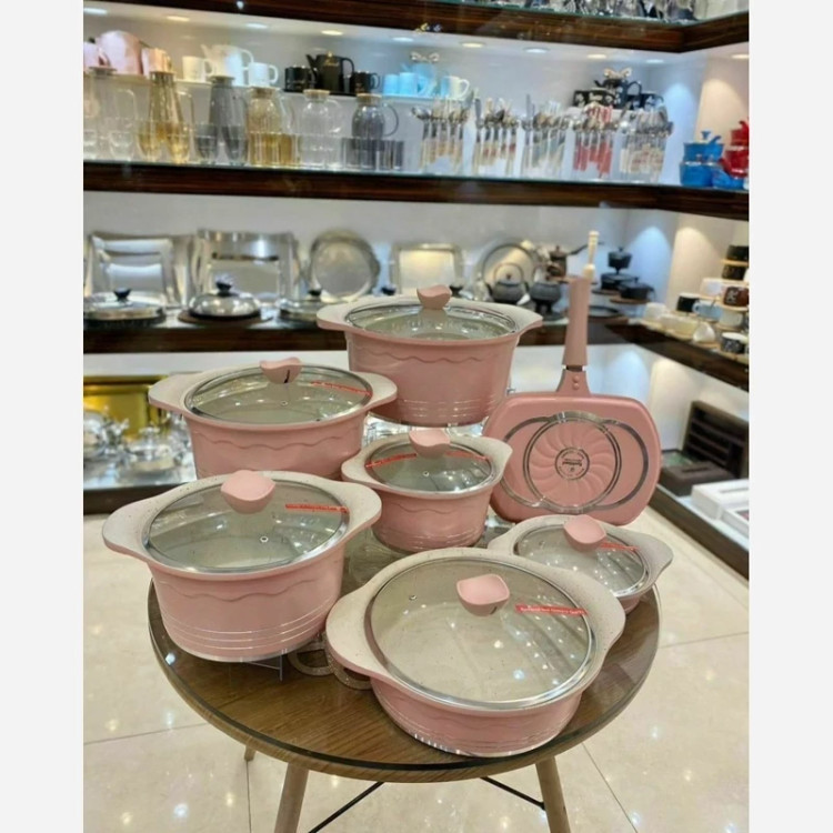 چدن ضخیم گرانیتی نچسب در 6 رنگ مشکی، طوسی ،رزگلد،نسکافه ای،کرم و بادمجانی دارای 4عدد قابلمه در سایزهای 32،28،24،20و دو عدد تابه در سایزهای 24و28 یک عدد تابه رژیمی کف قابلمه و تابه ها اینداکشن هستش مدل مونیخ 14پارچه دارای درب پیرکس با زه و قپه های استیل برند راکلند