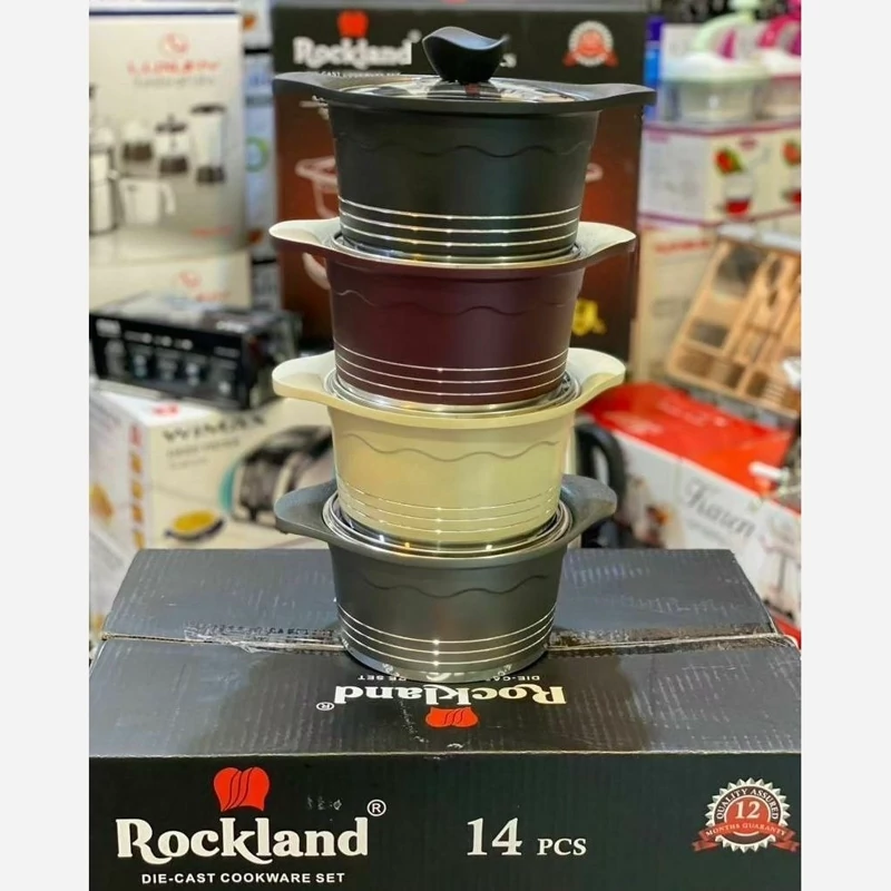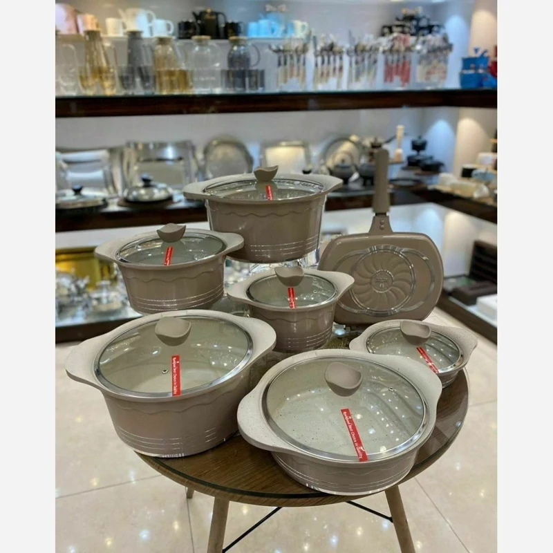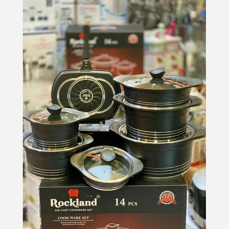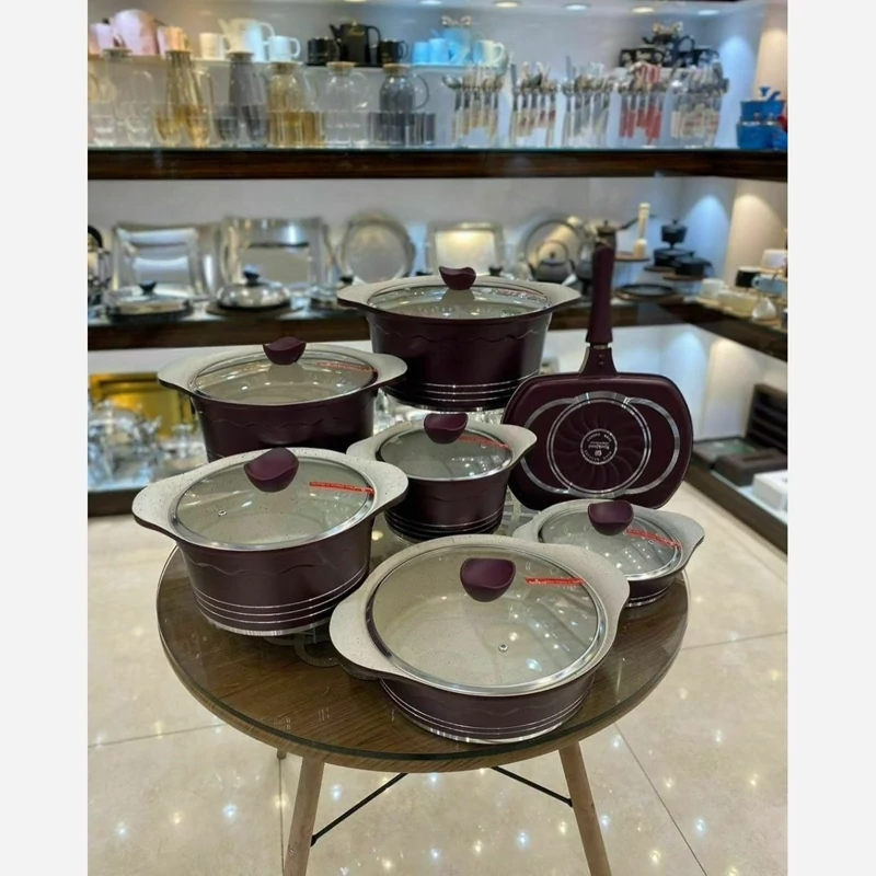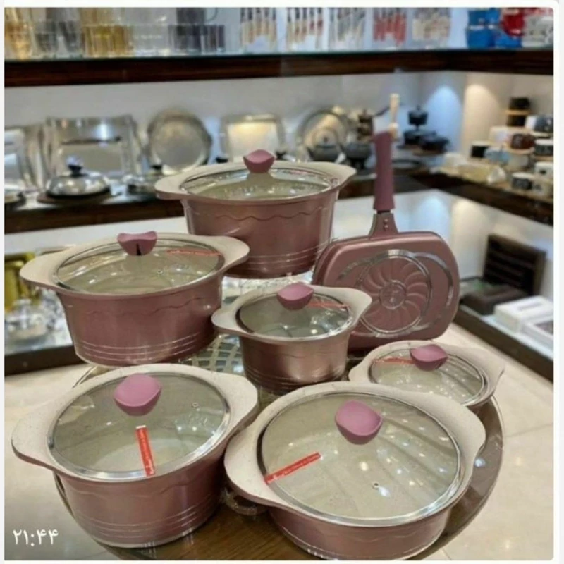 چدن ضخیم گرانیتی نچسب در 6 رنگ مشکی، طوسی ،رزگلد،نسکافه ای،کرم و بادمجانی دارای 4عدد قابلمه در سایزهای 32،28،24،20و دو عدد تابه در سایزهای 24و28 یک عدد تابه رژیمی کف قابلمه و تابه ها اینداکشن هستش مدل مونیخ 14پارچه دارای درب پیرکس با زه و قپه های استیل برند راکلند