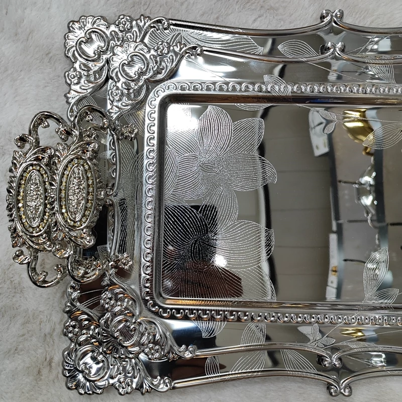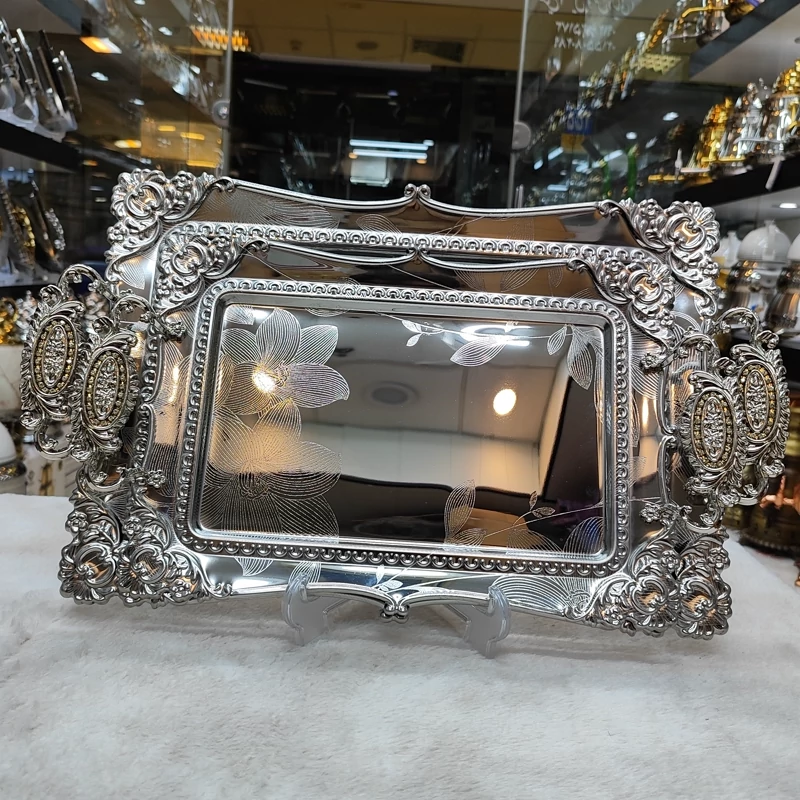 استیل وارداتی بسیار ضخیم (یک میل) دسته ها از جنس زاماک(آلیاژ روی و آلومینیوم) دو عددی در دو سایز کوچک و بزرگ سایز بزرگ(40در 28) سایز کوچک(33در 23) برند یونی هوم دارای جعبه کادویی شکیل طرح دار زیبا