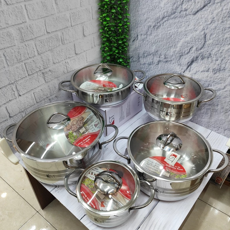 ساخته شده با استیل ورق یک میل ضخیم دارای کفه ی چدنی و اینداکشن دسته ها و قپه ی در استیل دارای درب پیرکس با زه استیل 10پارچه مفید قابلمه های سایز (28.24.20.16)و تابه دو دسته ی سایز 24 طرح جدید فوقوالعاده زیبا برند (kst ) کِی اِس تی کف هک شده
