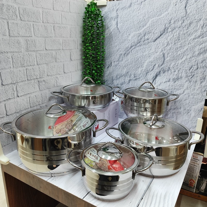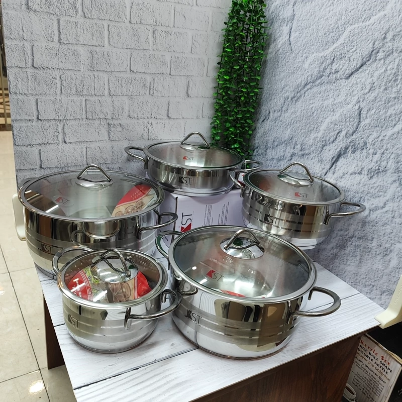 ساخته شده با استیل ورق یک میل ضخیم دارای کفه ی چدنی و اینداکشن دسته ها و قپه ی در استیل دارای درب پیرکس با زه استیل 10پارچه مفید قابلمه های سایز (28.24.20.16)و تابه دو دسته ی سایز 24 طرح جدید فوقوالعاده زیبا برند (kst ) کِی اِس تی کف هک شده