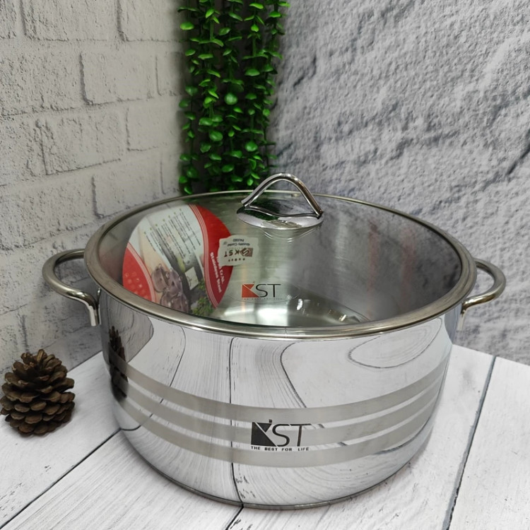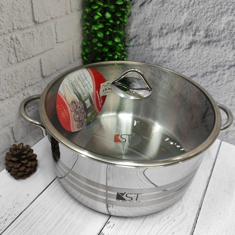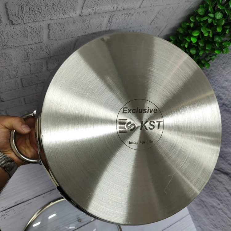 ساخته شده با استیل ورق یک میل ضخیم دارای کفه ی چدنی و اینداکشن دسته ها و قپه ی در استیل دارای درب پیرکس با زه استیل سایز 32 ارتفاع قابلمه 16سانتی متر بدون احتساب درب طرح جدید فوقوالعاده زیبا برند (kst ) کِی اِس تی کف هک شده دارای جعبه تک