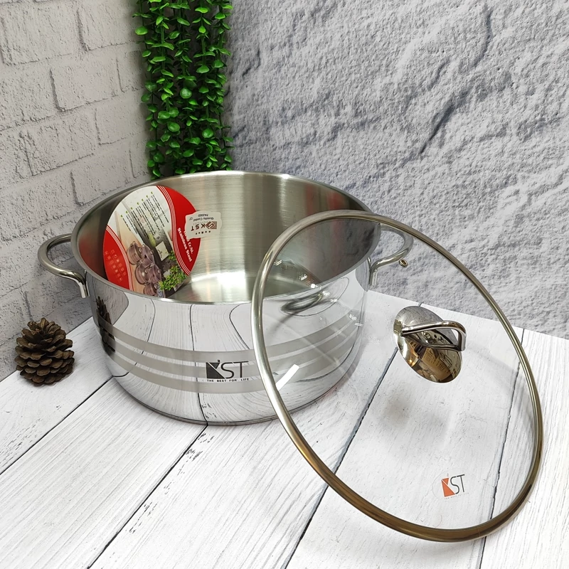 ساخته شده با استیل ورق یک میل ضخیم دارای کفه ی چدنی و اینداکشن دسته ها و قپه ی در استیل دارای درب پیرکس با زه استیل سایز 32 ارتفاع قابلمه 16سانتی متر بدون احتساب درب طرح جدید فوقوالعاده زیبا برند (kst ) کِی اِس تی کف هک شده دارای جعبه تک