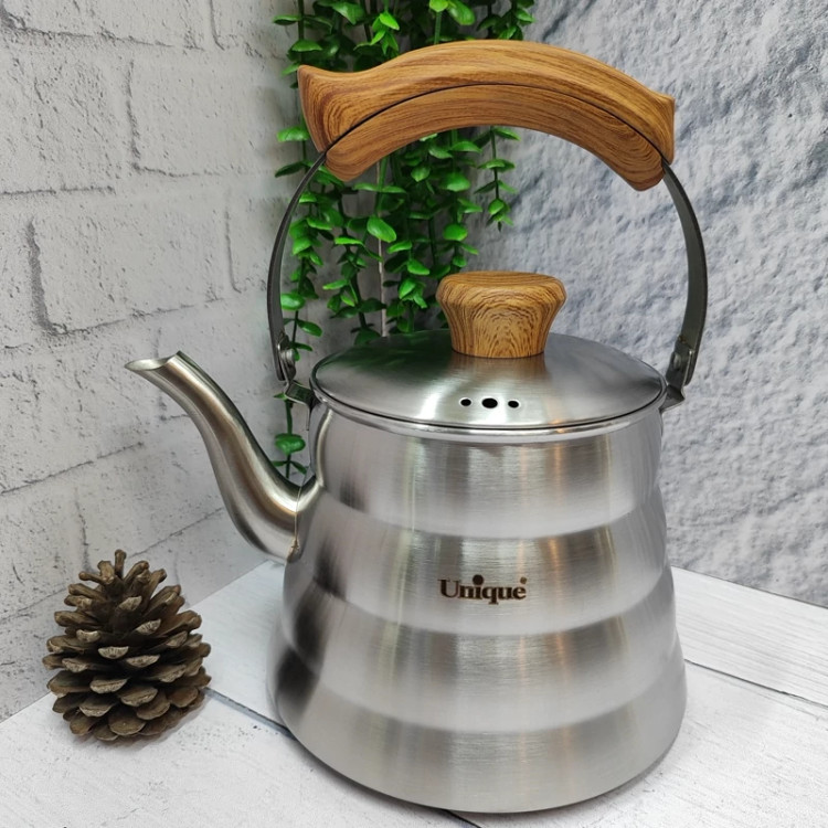 ساخته شده با ورق یک میل ضخیم و سنگین دارای کف چدنی هک شده یونیک که مقاومت و ایمنی کتری رو در برابر حرارت زیاد بالا میبره دسته ی طرح چوب زیبا مدل استیل مات دارای دو درب قپه دار و درب شبکه ای اعلا حجم 2/5لیتری آب مدل لوله مرغابی کد7252 برند یونیک