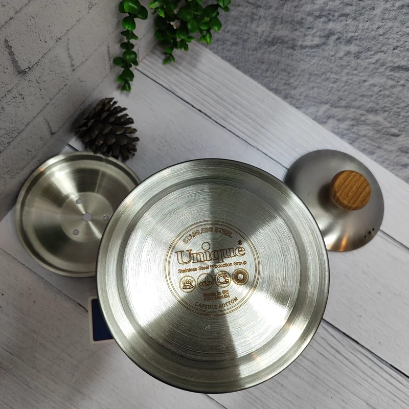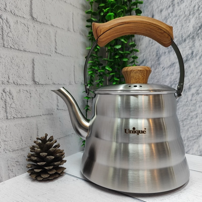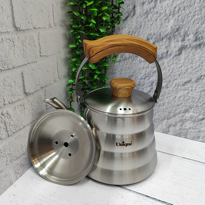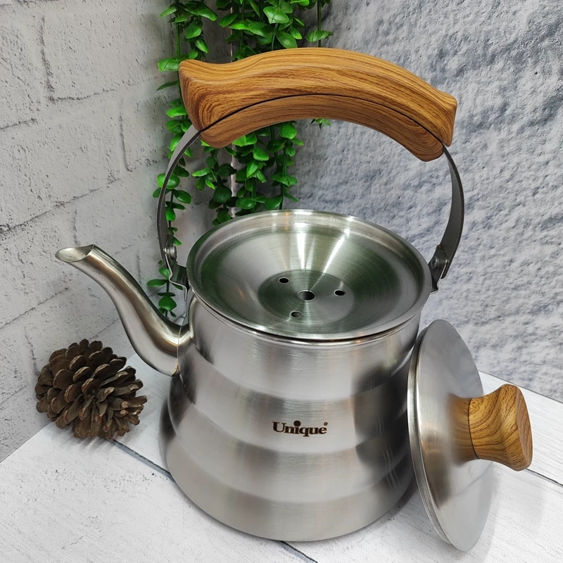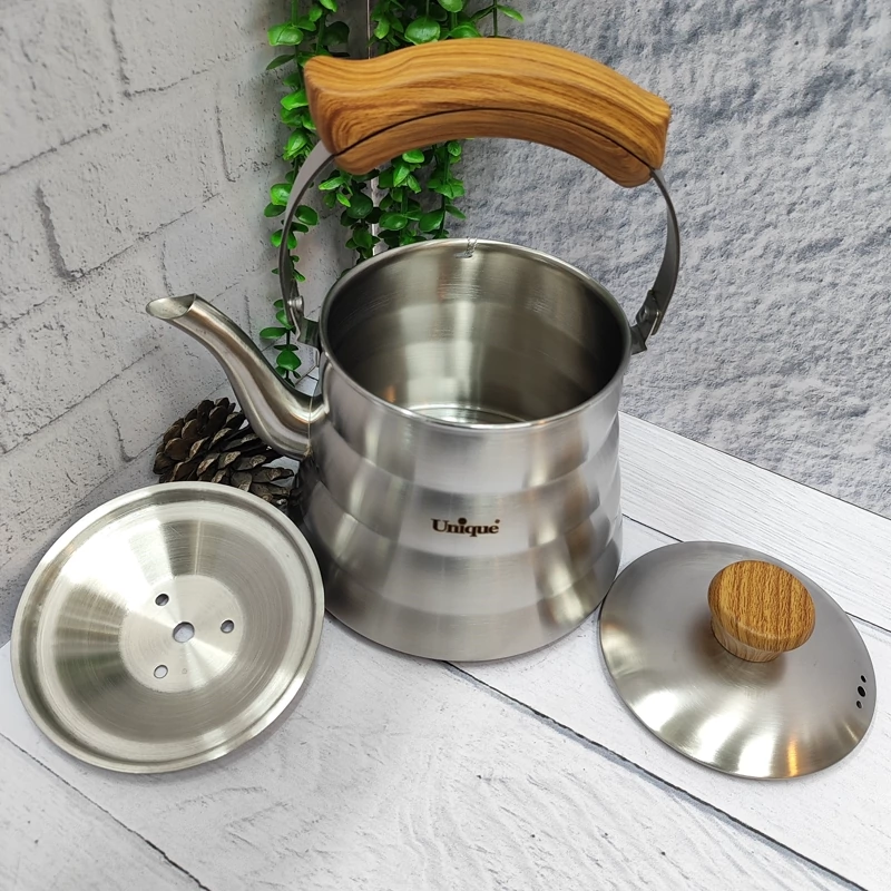 ساخته شده با ورق یک میل ضخیم و سنگین دارای کف چدنی هک شده یونیک که مقاومت و ایمنی کتری رو در برابر حرارت زیاد بالا میبره دسته ی طرح چوب زیبا مدل استیل مات دارای دو درب قپه دار و درب شبکه ای اعلا حجم 2/5لیتری آب مدل لوله مرغابی کد7252 برند یونیک