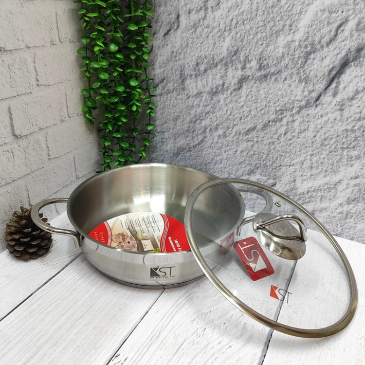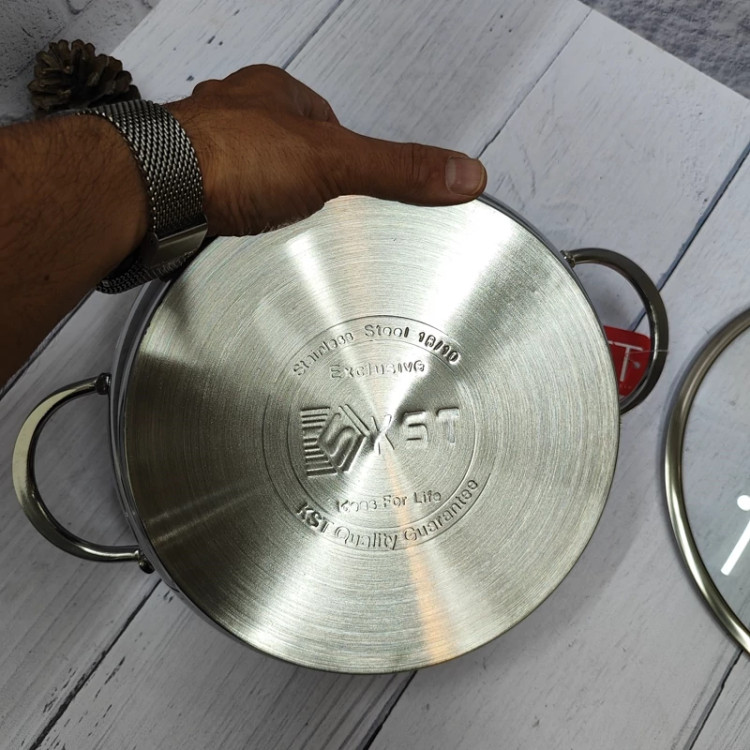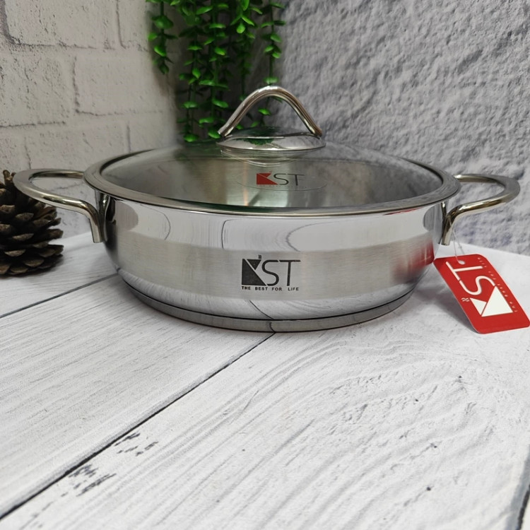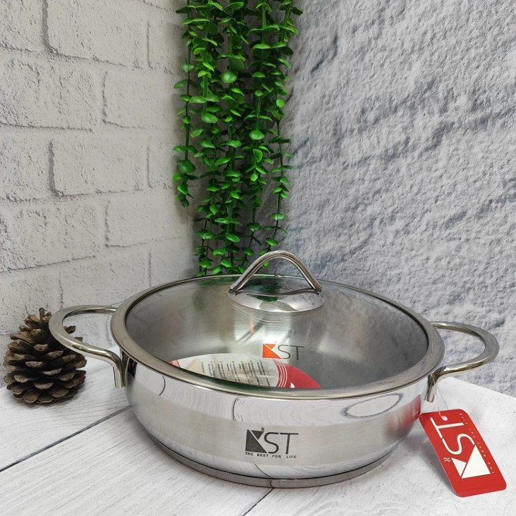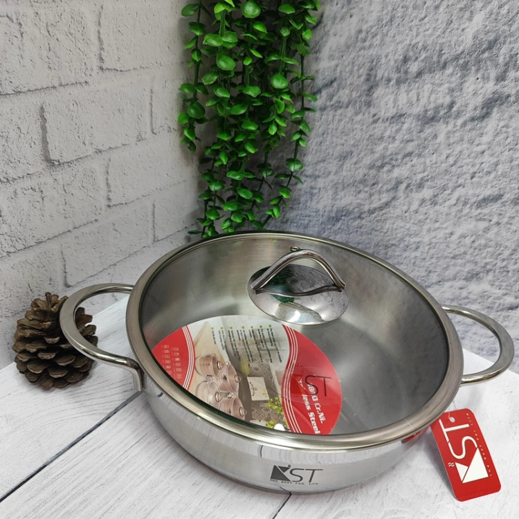 ساخته شده با استیل ورق یک میل ضخیم دارای کفه ی چدنی و اینداکشن دسته ها و قپه ی در استیل دارای درب پیرکس با زه استیل سایز 24 ارتفاع تابه 7/5سانتی متر بدون احتساب درب طرح جدید فوقوالعاده زیبا برند (kst ) کِی اِس تی کف هک شده دارای جعبه تک
