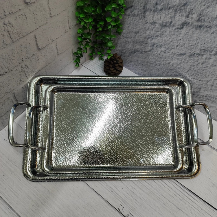 ساخته شده با ورق 0/6 نقره ای دور طلایی جنس دسته ها زاماک(آلیاژ روی و آلومینیوم) در دو سایز بزرگ(42/5در26) و متوسط(34/5در 22/5) طرح جدید پوست ماری برجسته مخصوص پذیرایی و کادویی همراه با جعبه شیک کادویی برند وینکس