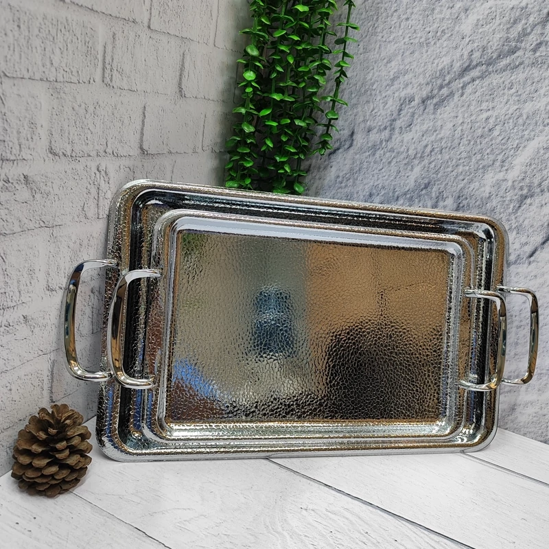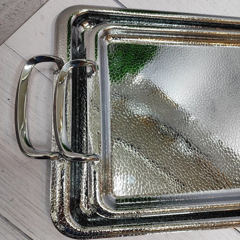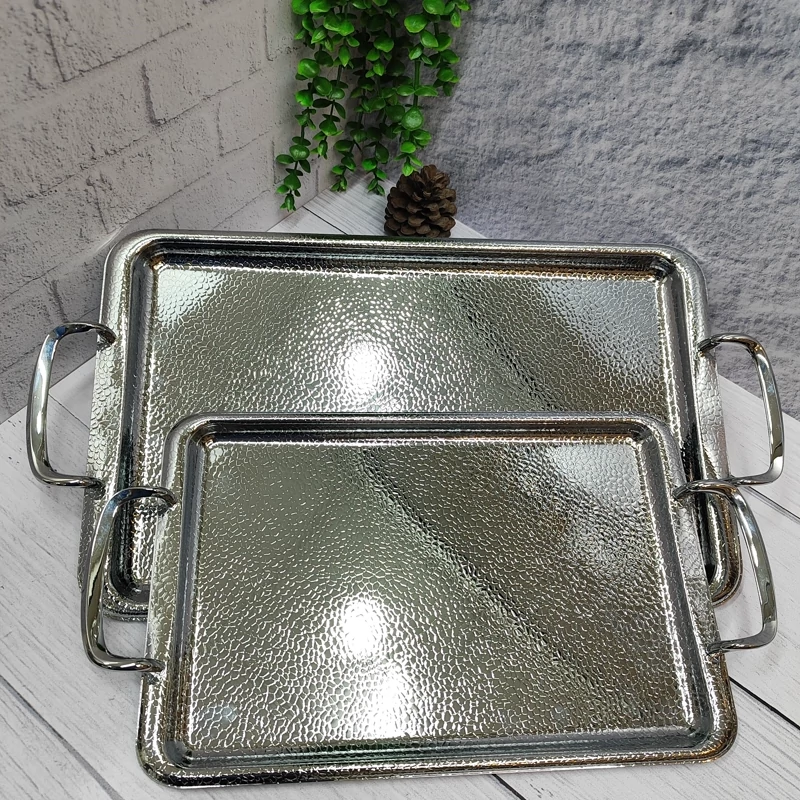 ساخته شده با ورق 0/6 نقره ای دور طلایی جنس دسته ها زاماک(آلیاژ روی و آلومینیوم) در دو سایز بزرگ(42/5در26) و متوسط(34/5در 22/5) طرح جدید پوست ماری برجسته مخصوص پذیرایی و کادویی همراه با جعبه شیک کادویی برند وینکس
