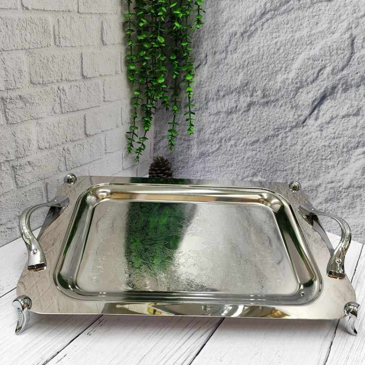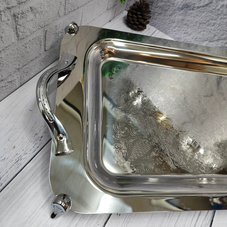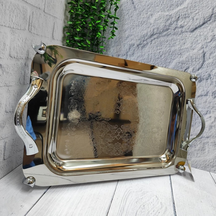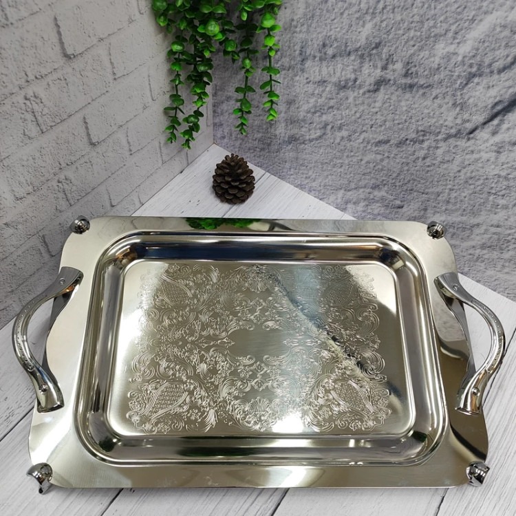 ساخته شده با ورق استیل 0/8ضخیم کف طرح دار پرداخت بسیار عالی پایه دار.(ارتفاع پایه از لبه سینی 4سانتی متر) دسته و پایه از جنس زاماک(آلیاژ روی و آلومینیوم) سایز بزرگ(46/5در30) جعبه دار برنده (ایده) مخصوص پذیرایی و کادویی دو سایز داره که این سایز بزرگه سایز کوچکتر هم موجوده
