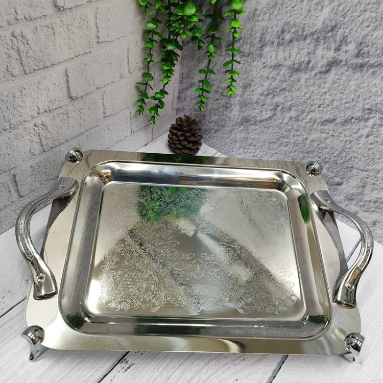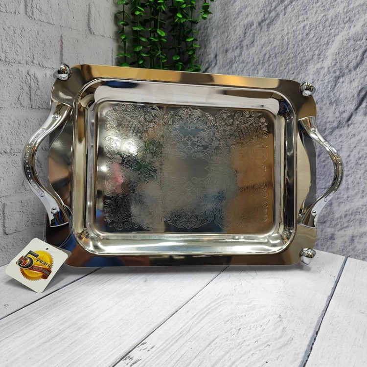 ساخته شده با ورق استیل 0/8ضخیم کف طرح دار پرداخت بسیار عالی پایه دار.(ارتفاع پایه از لبه سینی 4سانتی متر) دسته و پایه از جنس زاماک(آلیاژ روی و آلومینیوم) سایز متوسط(37در26) جعبه دار برنده (ایده) مخصوص پذیرایی و کادویی دو سایز داره که این سایز متوسطه سایز بزرگتر هم موجوده