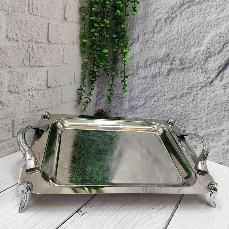 ساخته شده با ورق استیل 0/8ضخیم کف طرح دار پرداخت بسیار عالی پایه دار.(ارتفاع پایه از لبه سینی 4سانتی متر) دسته و پایه از جنس زاماک(آلیاژ روی و آلومینیوم) سایز متوسط(37در26) جعبه دار برنده (ایده) مخصوص پذیرایی و کادویی دو سایز داره که این سایز متوسطه سایز بزرگتر هم موجوده