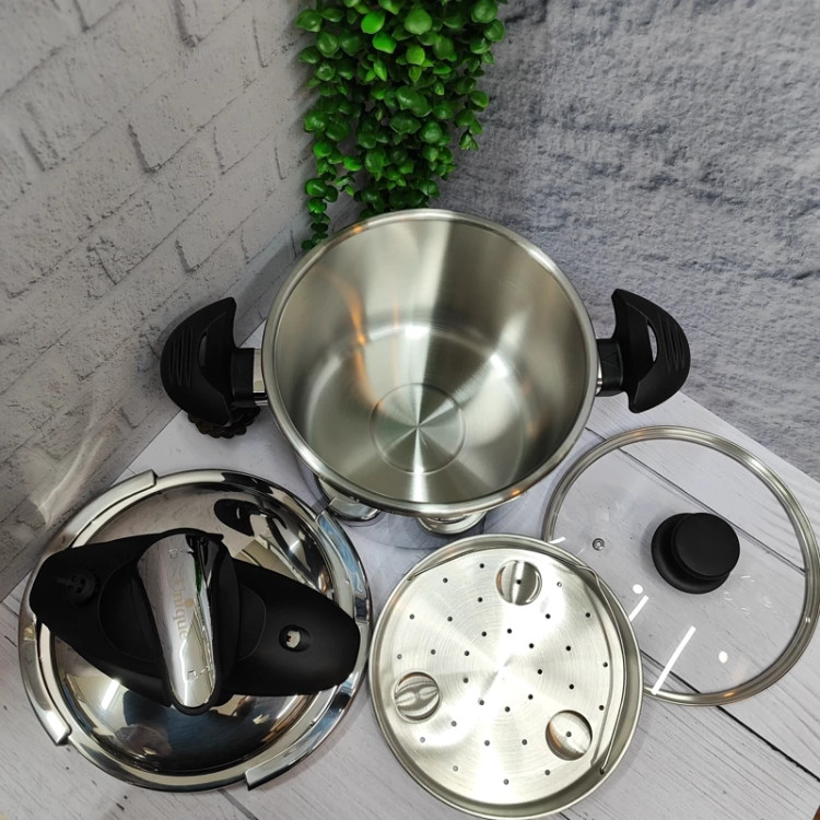 استیل درجه یک و فوق ضخیم یک میل یک عدد درب استیل قفل کلیپسی و یک عدد درب پیرکس کف زود پز کپسولی حاوی آلیاژ آلومینیوم استفاده شده که حرارت و به صورتیکنواخت داخل زود پز انتقال میده دسته ها از جنس باکالیت 5لیتری (6 و 7لیتر هم موجوده) قطر دهانه 22سانتی متر یک عدد سوپاپ تنظیم فشار و بخار و یک عدد سوپاپ اطمینان دیواره بلند واشر دار ( و یک عدد زاپاس) دارای دریچه اطمینان دارای یک عدد بخارپز استیل برند با اصالت و درجه یک (یونیک) کد8614
