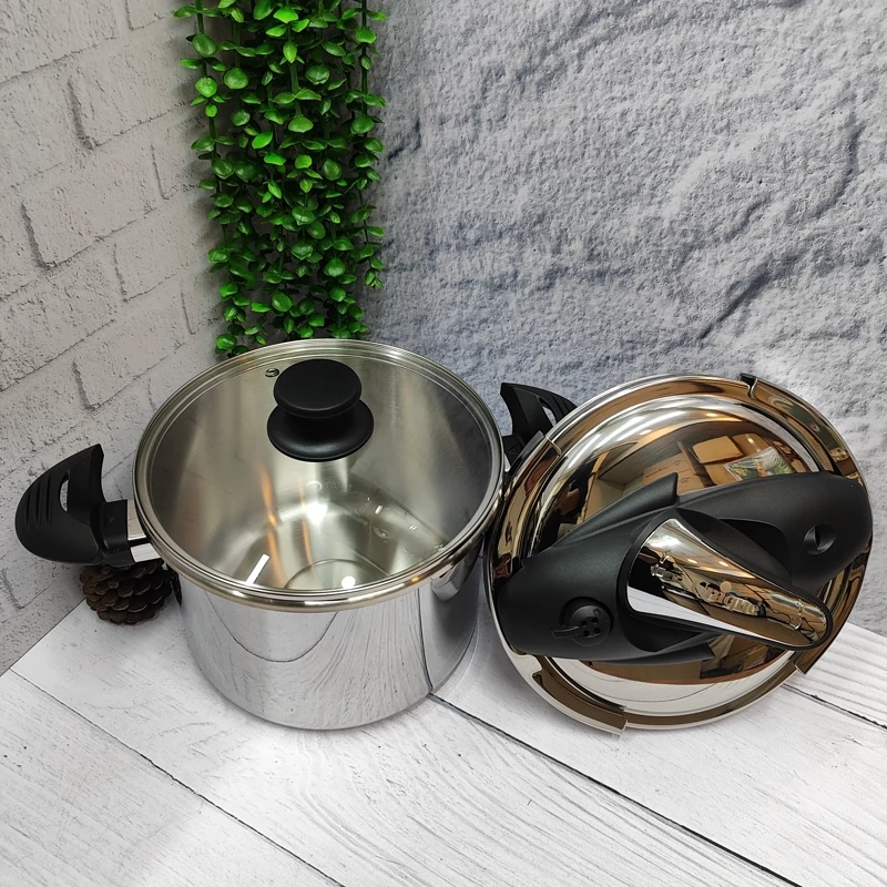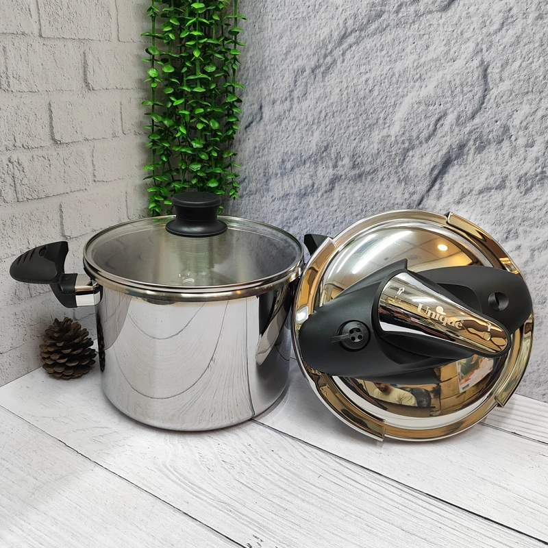 استیل درجه یک و فوق ضخیم یک میل یک عدد درب استیل قفل کلیپسی و یک عدد درب پیرکس کف زود پز کپسولی حاوی آلیاژ آلومینیوم استفاده شده که حرارت و به صورتیکنواخت داخل زود پز انتقال میده دسته ها از جنس باکالیت 5لیتری (6 و 7لیتر هم موجوده) قطر دهانه 22سانتی متر یک عدد سوپاپ تنظیم فشار و بخار و یک عدد سوپاپ اطمینان دیواره بلند واشر دار ( و یک عدد زاپاس) دارای دریچه اطمینان دارای یک عدد بخارپز استیل برند با اصالت و درجه یک (یونیک) کد8614