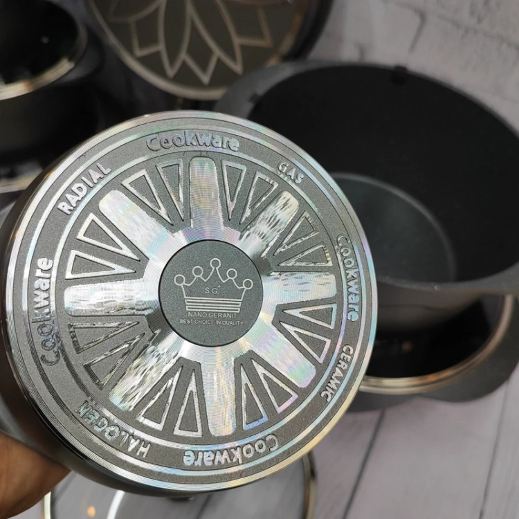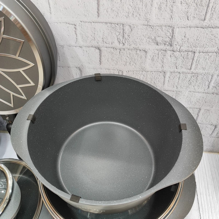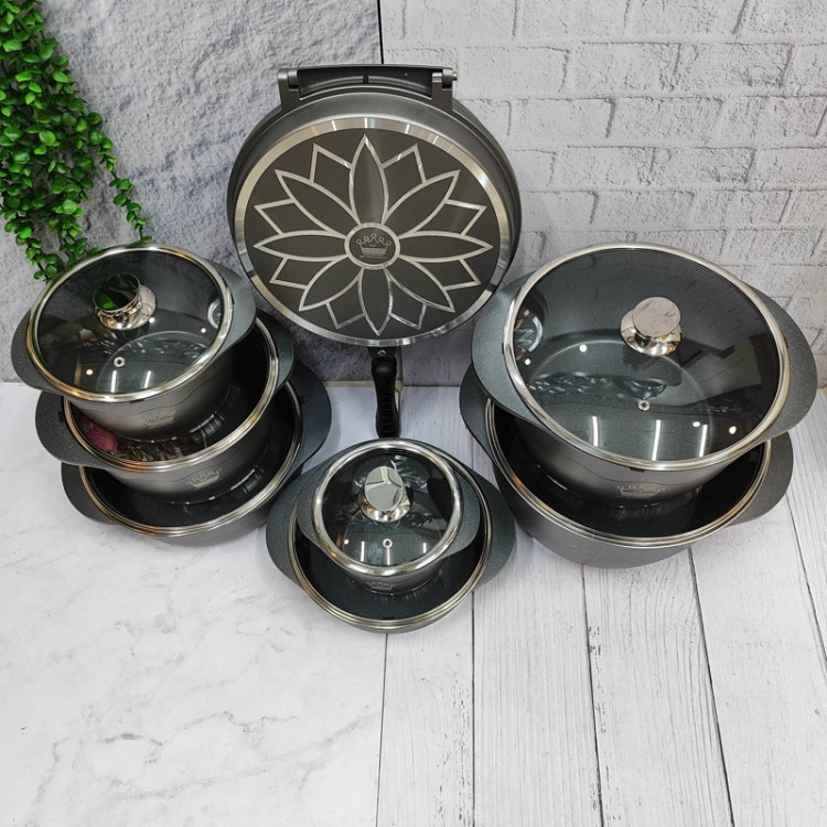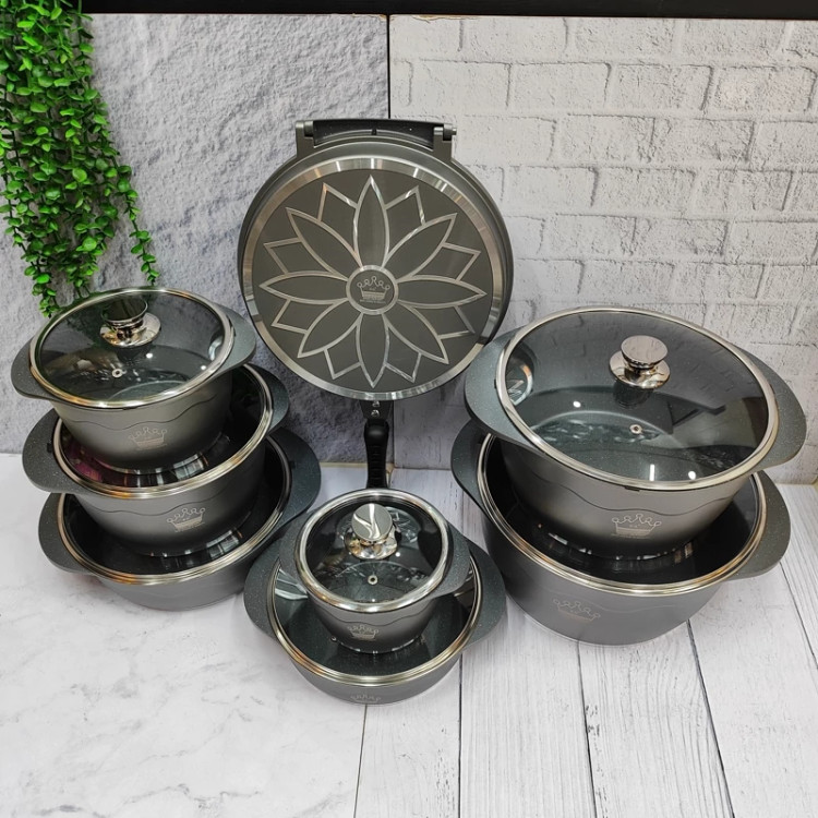 سری جدید با طراحی بسیار زیبا( ویتنبرگ) چدن آلومینیوم ضخیم گرانیت داخلی سه لایه درجه یک دارای قابلمه های 32.28.24.20.16 تابه ی دو دسته سایز 28 و 24 و تابه ی رژیمی گرد سایز 32 16پارچه مفید رنگ طوسی(رنگ مشکی هم موجوده) دارای درب پیرکس با قپه های فلزی کفه ی قابلمه ها و تابه ها اینداکشن(ایمنی و دوام در برابر حرارت زیاد بالا میبره) و هک شده سرویس کاملا قیمت اقتصادی برند اس جی(ویتنبرگ)