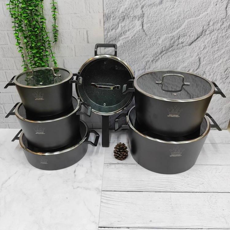 سری جدید با طراحی بسیار زیبا( طرح آکا ) چدن آلومینیوم ضخیم گرانیت داخلی سه لایه درجه یک دارای قابلمه های 32.28.24.20 تابه ی دو دسته سایز 28 و تابه ی تک دسته سایز 24 12پارچه مفید رنگ مشکی(طوسی هم موجوده) دارای درب پیرکس با قپه های فلزی ضخیم کفه ی قابلمه ها و تابه ها اینداکشن(ایمنی و دوام در برابر حرارت زیاد بالا میبره) و هک شده سرویس کاملا قیمت اقتصادی برند اس جی