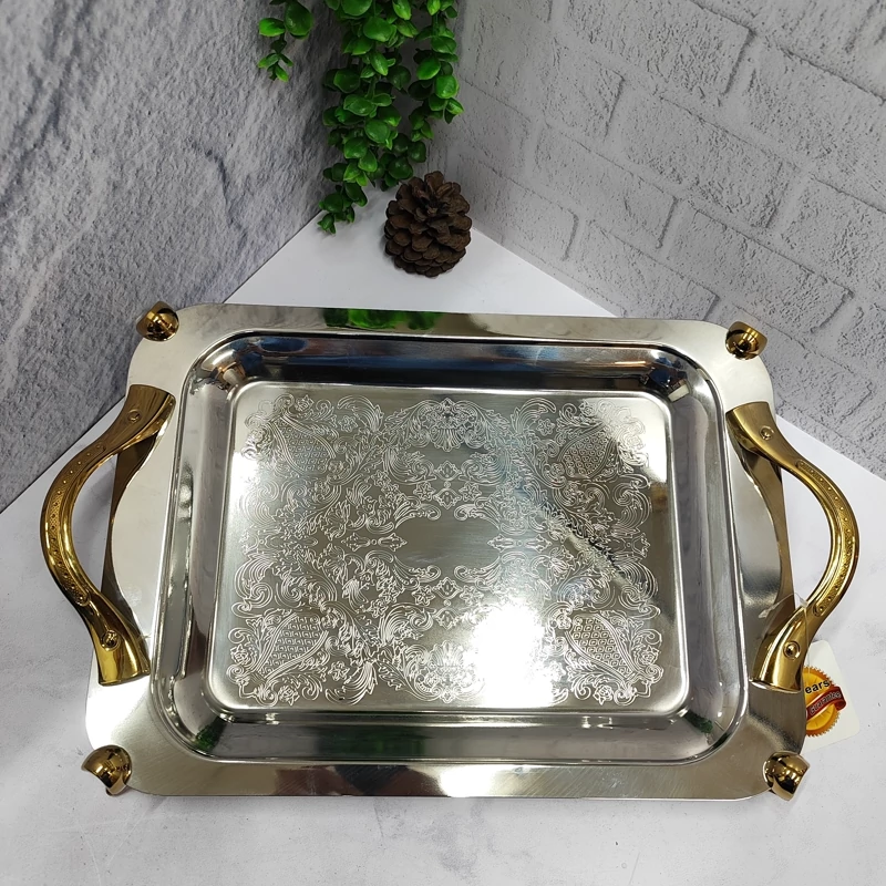 سینی استیل پذیرایی پایه دار طلایی