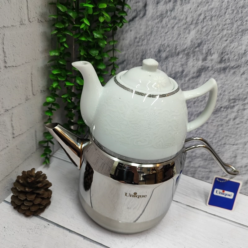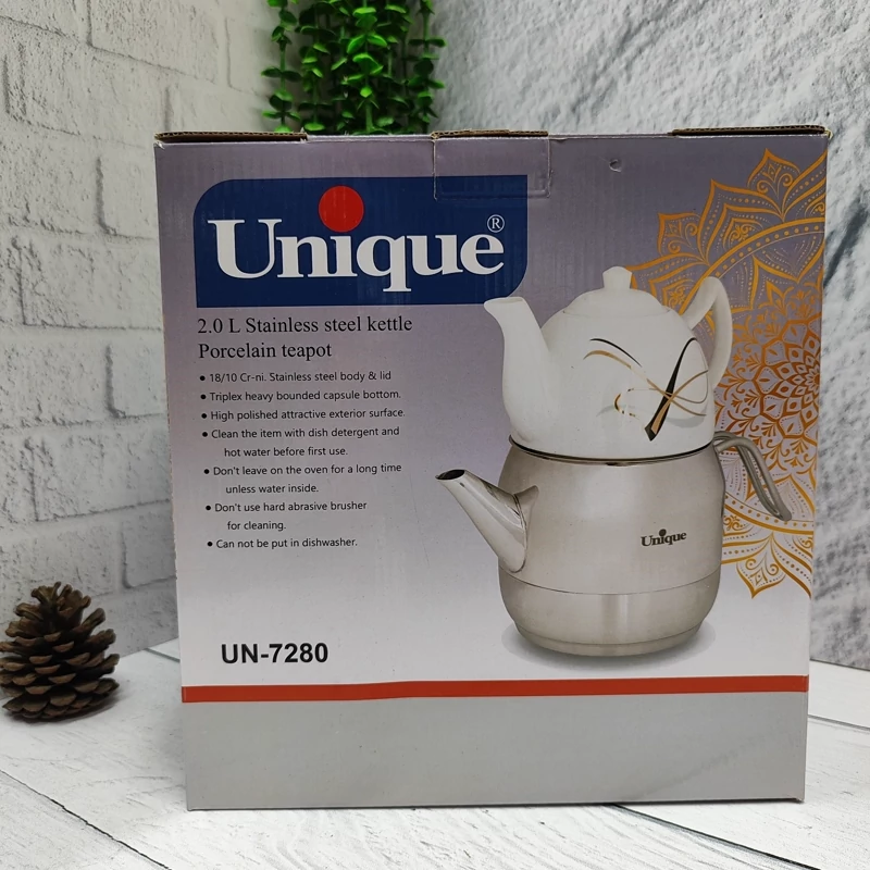 ساخته شده با ورق یک میل ضخیم و سنگین دارای کف چدنی هک شده یونیک که مقاومت و ایمنی کتری رو در برابر حرارت زیاد بالا میبره دسته استیل جدید مدل استیل مات و براق دارای درب شبکه ای اعلا حجم 2لیتری آب لوله دار قوری چینی طرح دار زیبا کد7280 برند یونیک