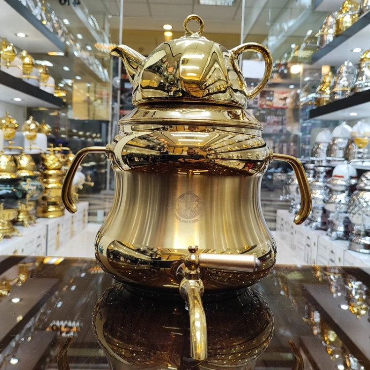 از تولیدات کارخانه با ورق استیل یک میل ضخیم تمام طلایی رنگ ثابت تضمینی گنجایش 6لیتری اب کفه چدنی مقاوم و ایمن که باعث میشه با خیال راحت بتونید روی حرارت زیاد استفاده کنید دسته و شیر خارجی اعلا دارای درب شبکه ای قوری چینی طرحدار طلایی پی وی دی شده 24ماه ضمانت برند اس لوکس