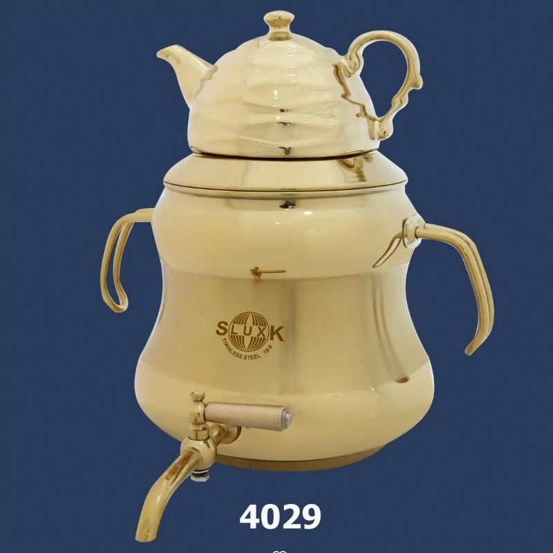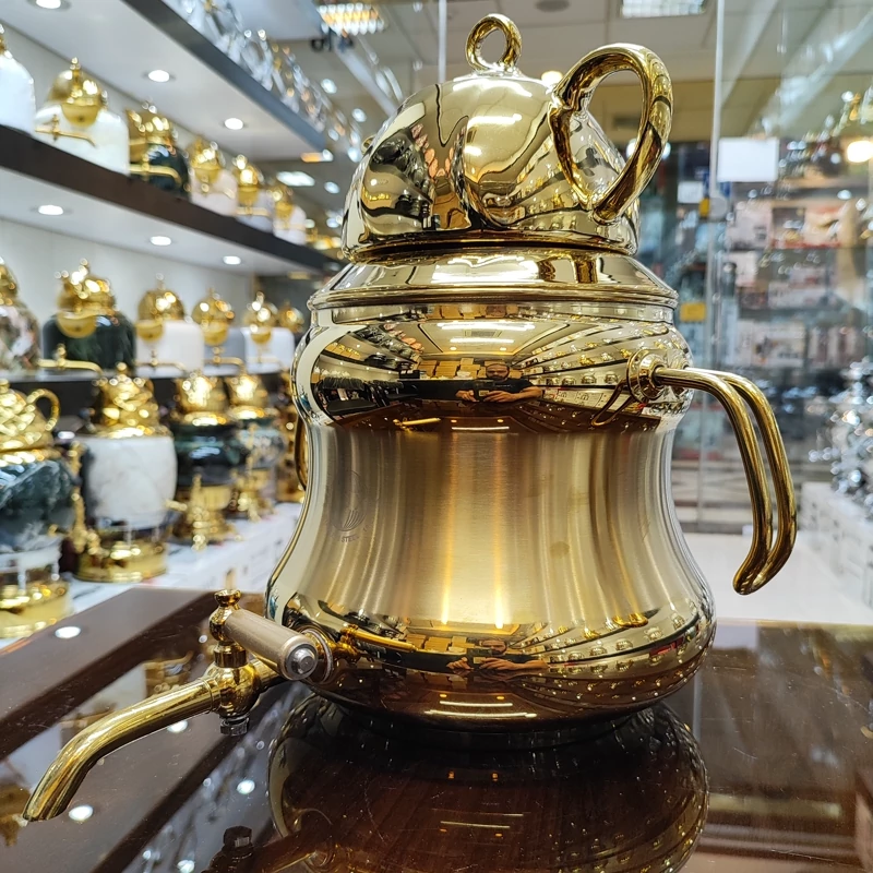 از تولیدات کارخانه با ورق استیل یک میل ضخیم تمام طلایی رنگ ثابت تضمینی گنجایش 6لیتری اب کفه چدنی مقاوم و ایمن که باعث میشه با خیال راحت بتونید روی حرارت زیاد استفاده کنید دسته و شیر خارجی اعلا دارای درب شبکه ای قوری چینی طرحدار طلایی پی وی دی شده 24ماه ضمانت برند اس لوکس