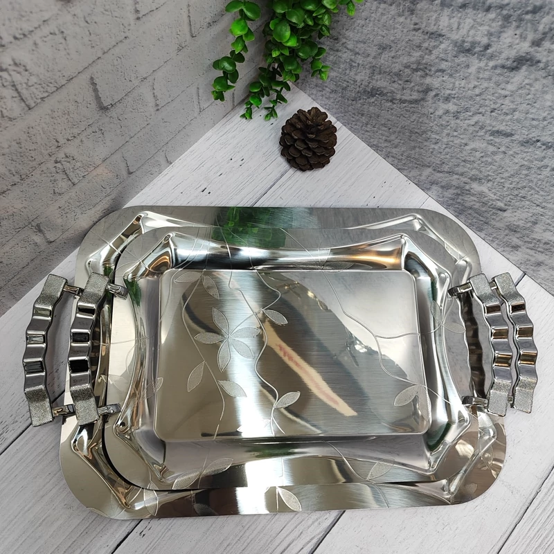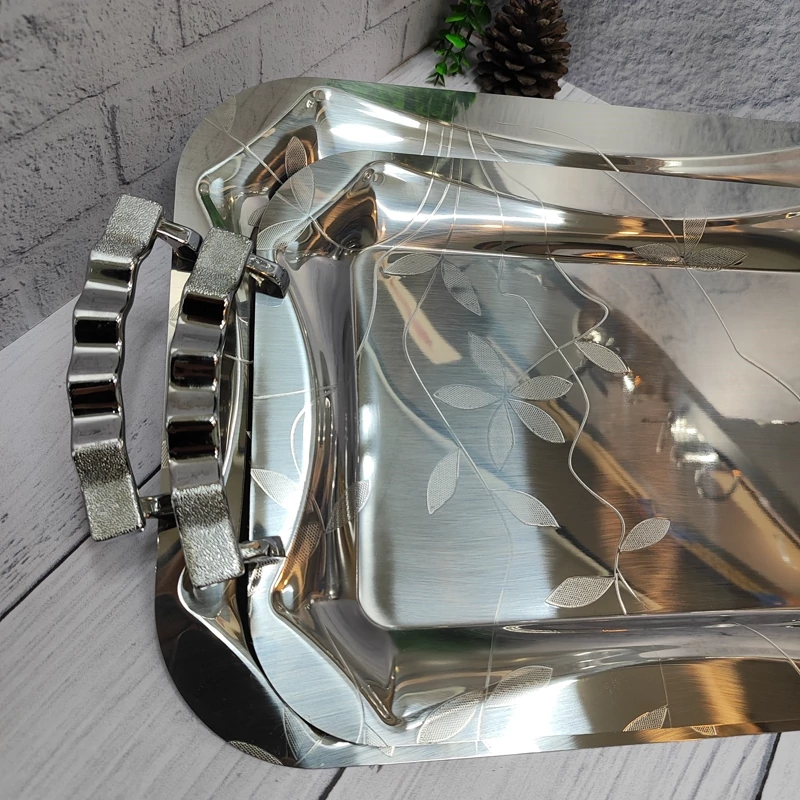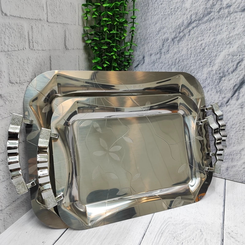 ساخته شده با ورق استیل 0/8ضخیم دو عددی در دو سایز بزرگ و متوسط سایز بزرگ(43در 30/5) سایز متوسط(36در 25/5) جنس دسته ها زاماک(آلیاژ روی و آلومینیوم) استیل آهنربا نگیر مدل مستطیل برگی زیبا همراه با جعبه کادویی شکیل مناسب برای پذیرایی و کادویی در 10طرح مختلف برند وینکس